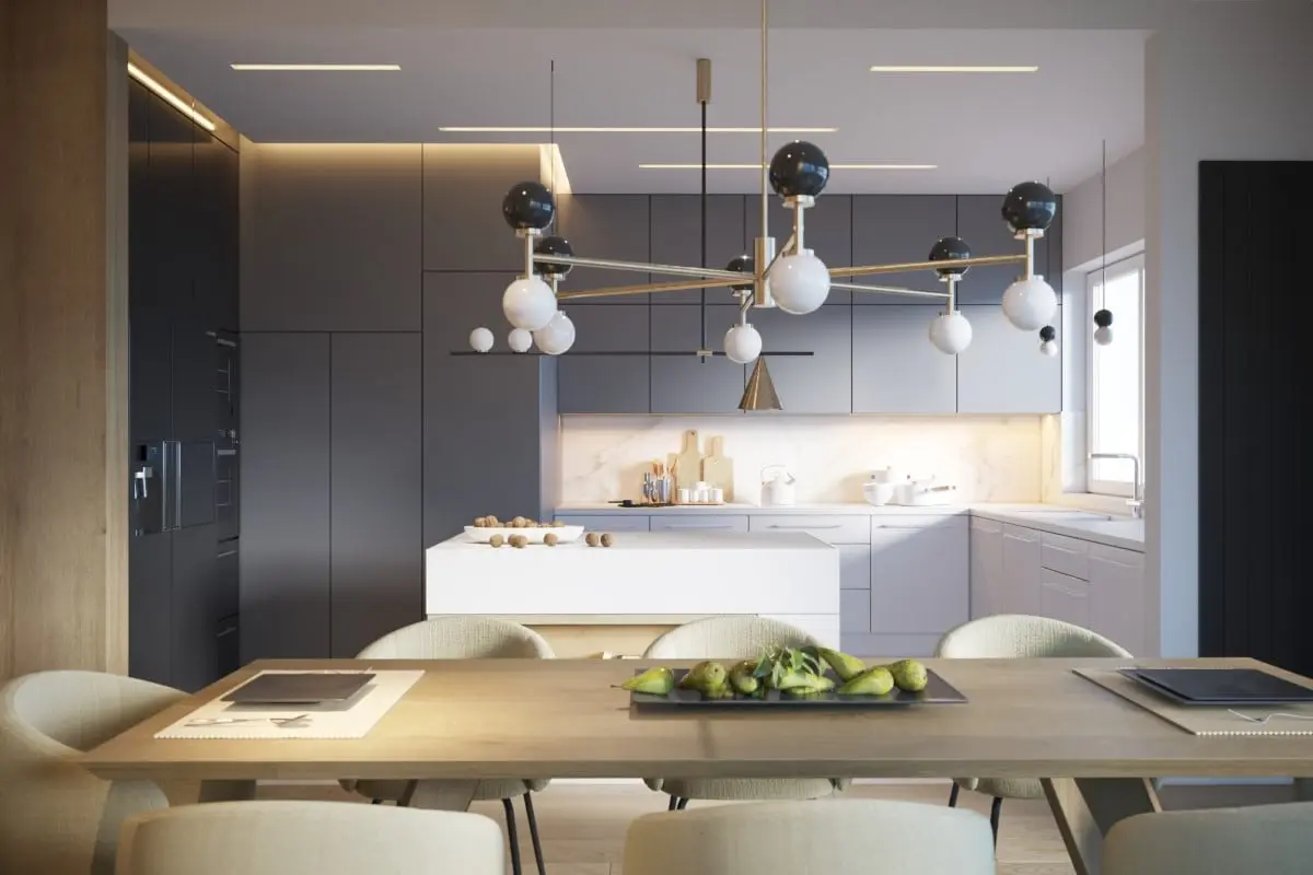 Matowe wykończenie posadzki idealnie harmonizuje z minimalistycznymi frontami szafek kuchennych, które stanowią idealne tło dla otwartej strefy dziennej.
