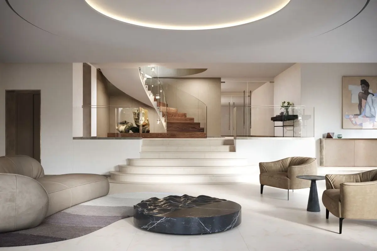 Strefa holu od samego wejścia sygnalizuje jaki będzie styl pozostałych wnętrz. Architektka zdecydowała się pozostawić kamienną posadzę, ale dzięki zestawieniu jej z drzwiami z dłutowanego drewna, postarzanym lustrem w mosiężnej ramie i stylowymi meblami tapicerowanymi, przestrzeń nabrała nowego wyrazu. Powierzchnia ścian wykończona jest drewnianą okładziną oraz tapetą z tkaniny przeplatanej nitkami z metalu szlachetnego. Szklane poręcze zyskały akcenty z mosiądzu, podobnie jak drzwi i okna. W centrum pomieszczenia stanął wyjątkowy, kamienny stolik – rzeźba autorstwa francuskiego artysty, Mathieu Lehanneura. Sztuka w postaci fotografii i rzeźb przewija się przez niemal wszystkie pomieszczenia. Warto zwrócić uwagę na to, że w wielu miejscach oświetlenie zaplanowano tak, aby nie „przeszkadzało” sztuce. Nie ma wiszących żyrandoli, które przesłaniałyby widok na ściany, ponadto punktowe światło jest ustawione w taki sposób, aby eksponować dzieła sztuki.