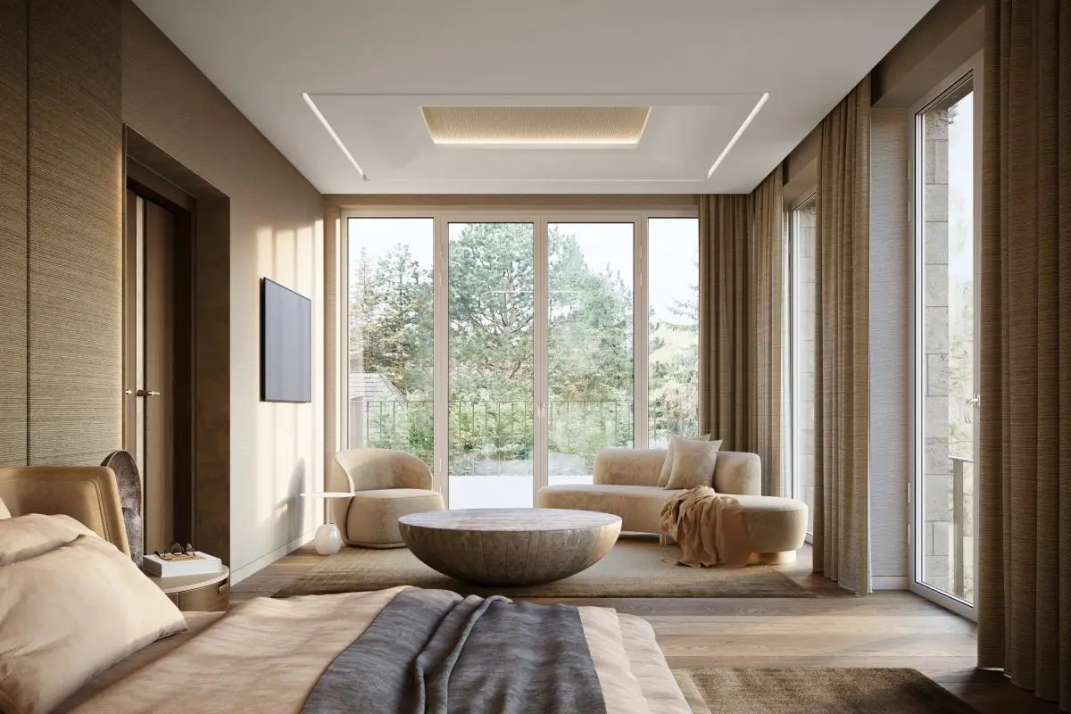 W głównej sypialni sypialni ściany i sufit wyłożone są tkaninami i tekstylnymi tapetami. Uwagę zwraca zwłaszcza powierzchnia ściany za wezgłowiem łóżka, która tworzy unikatową rzeźbiarską formę, ponadto wpływa na akustykę wnętrza, tłumi dźwięki, wycisza. Lampki na bocznych szafkach to przepiękne kamienne rzeźby, z piaskowanego marmuru. Blaty szafek są tapicerowane tym samym materiałem, którym obite jest łóżko, co efektownie dopełnia aranżację.