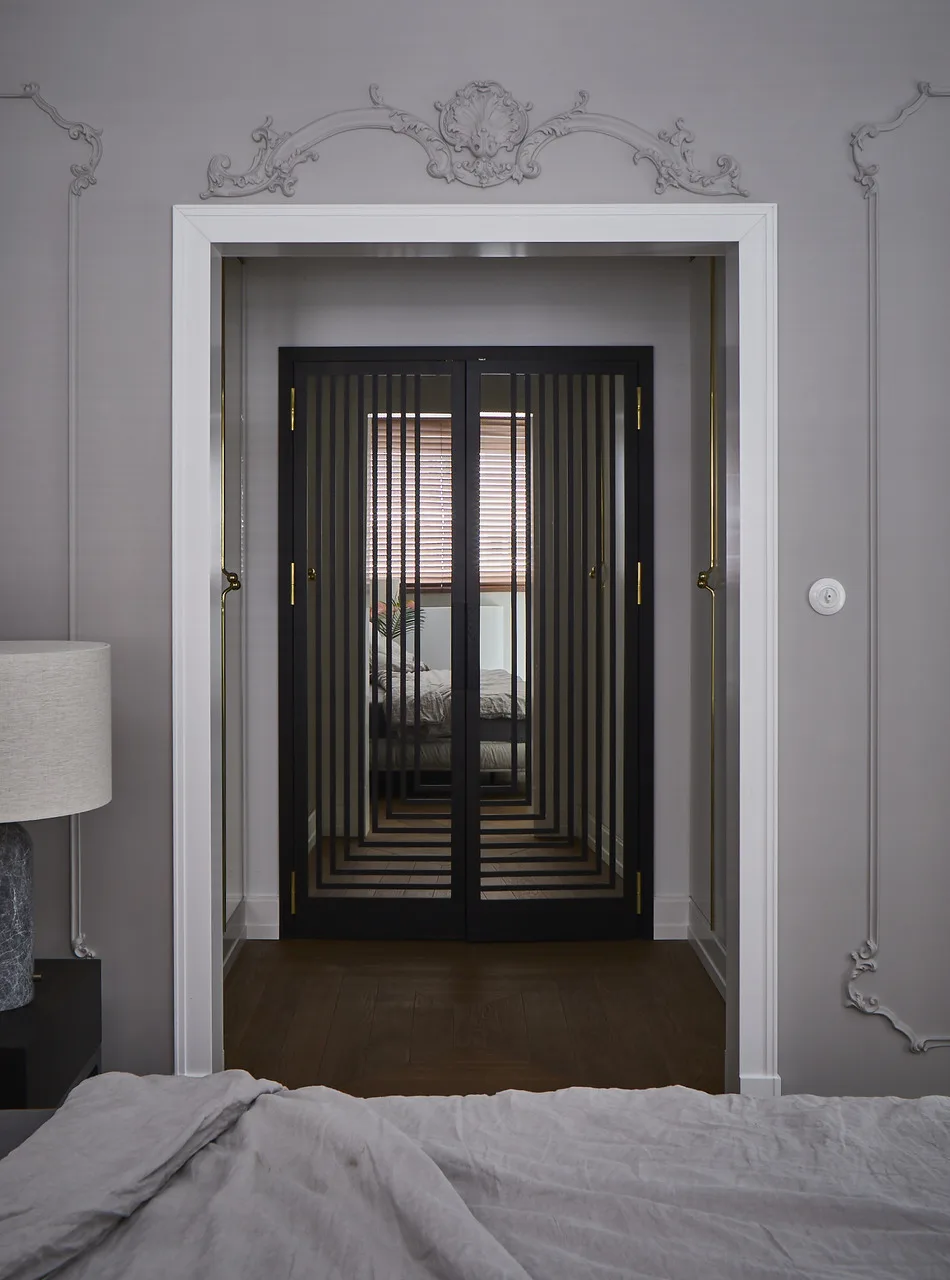 W sypialni wzrok przykuwają drzwi garderoby zdobione wykonanymi ręcznie przez jubilera uchwytami z mosiądzu.