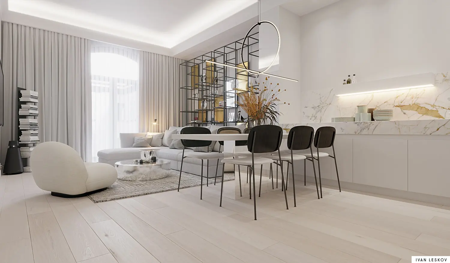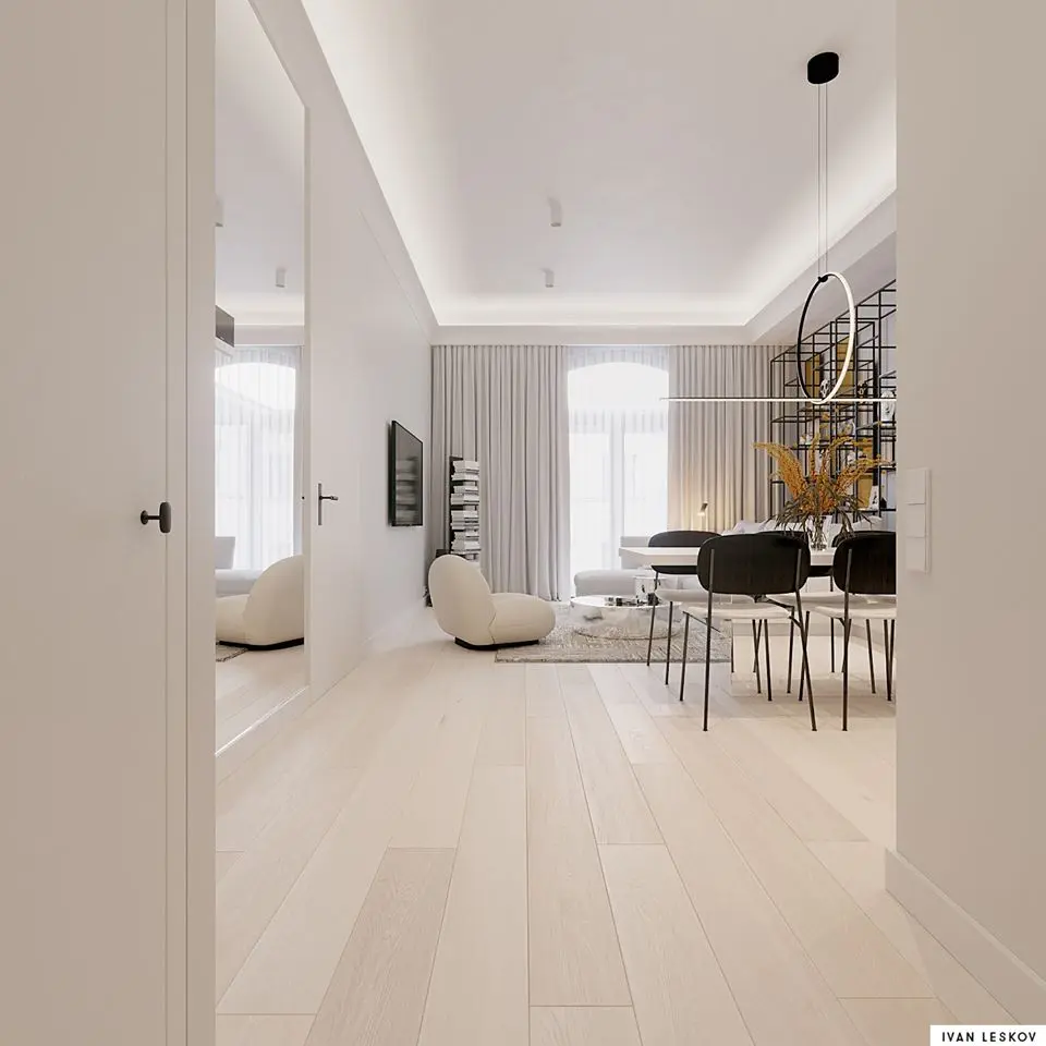Mistrzem w projektowaniu minimalistycznych lecz z ciekawymi detalami jest architekt Ivan Leskov. Przedstawiamy kolejny znakomity projekt niewielkiego apartamentu składającego się z otwartej kuchni na salon oraz z przytulnej w szarości sypialni.