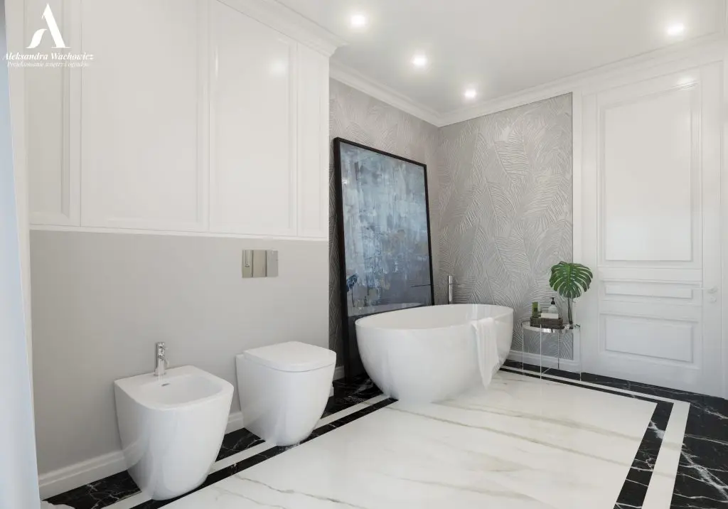 Łazienka zaskakuję, tu również znajdujemy odrobinę szaleństwa w tym stonowanym i eleganckim wnętrzu. Pani architekt idealnie połączyła płytki marmurowe z piękną, soczysto-zieloną tropikalną tapetą. W łazience mamy do wyboru prysznic lub wannę wolnostojącą. Marmurowe blaty jak równiez podłoga podkreśla ekskluzywny charakter. Spójnym elementem całego mieszkania to szafy w stylu prowansalskim, z ażurowymi drzwiami.