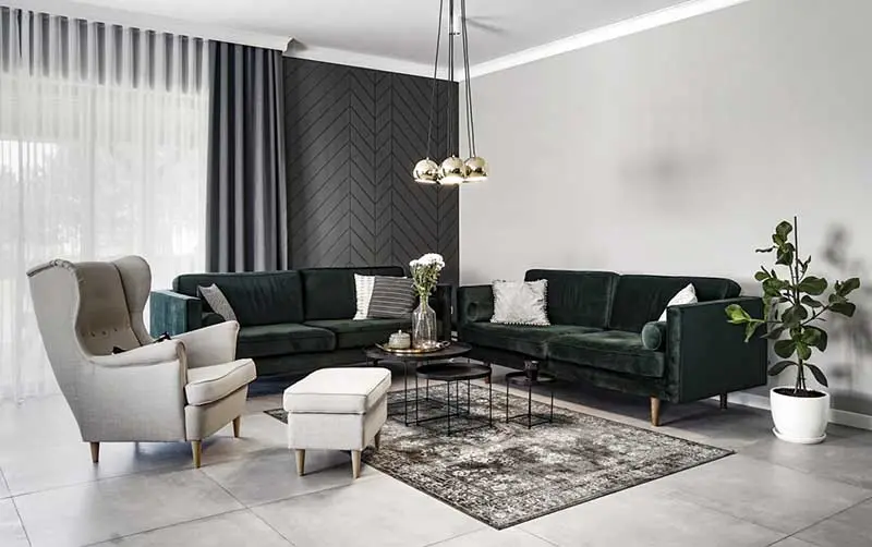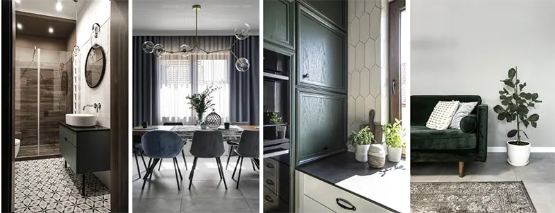 W mieszkaniu dominują odcienie szarości, gdzieniegdzie przełamane różnymi tonami zieleni oraz doskonale z nią współgrającym złotem. Z tego względu, że w aranżacji przeważają dość surowe elementy zaczerpnięte, na przykład ze stylu industrialnego a na podłodze w salonie zamiast tradycyjnego drewnianego parkietu znalazły się szare płytki imitujące beton, architekci postanowili ocieplić wnętrze za pomocą sprawdzonych zabiegów. Nie bez przyczyny miękkie meble w większości są obite aksamitnym welurem, okno przystrajają ciężkie zasłony, a strefę telewizyjną wyznaczają drewniane szczebelki.