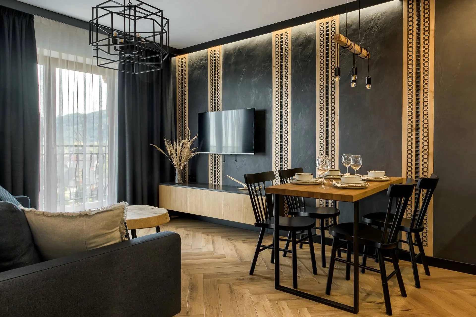 Meble w głębokich odcieniach grafitu stanowiły solidne tło dla intensywnej czerwieni i granatu, nadając pomieszczeniom zmysłowości i pełni charakteru. Drewniane elementy, takie jak rustykalne stoły czy drewniane sufity, wprowadziły do wnętrza organiczny akcent.