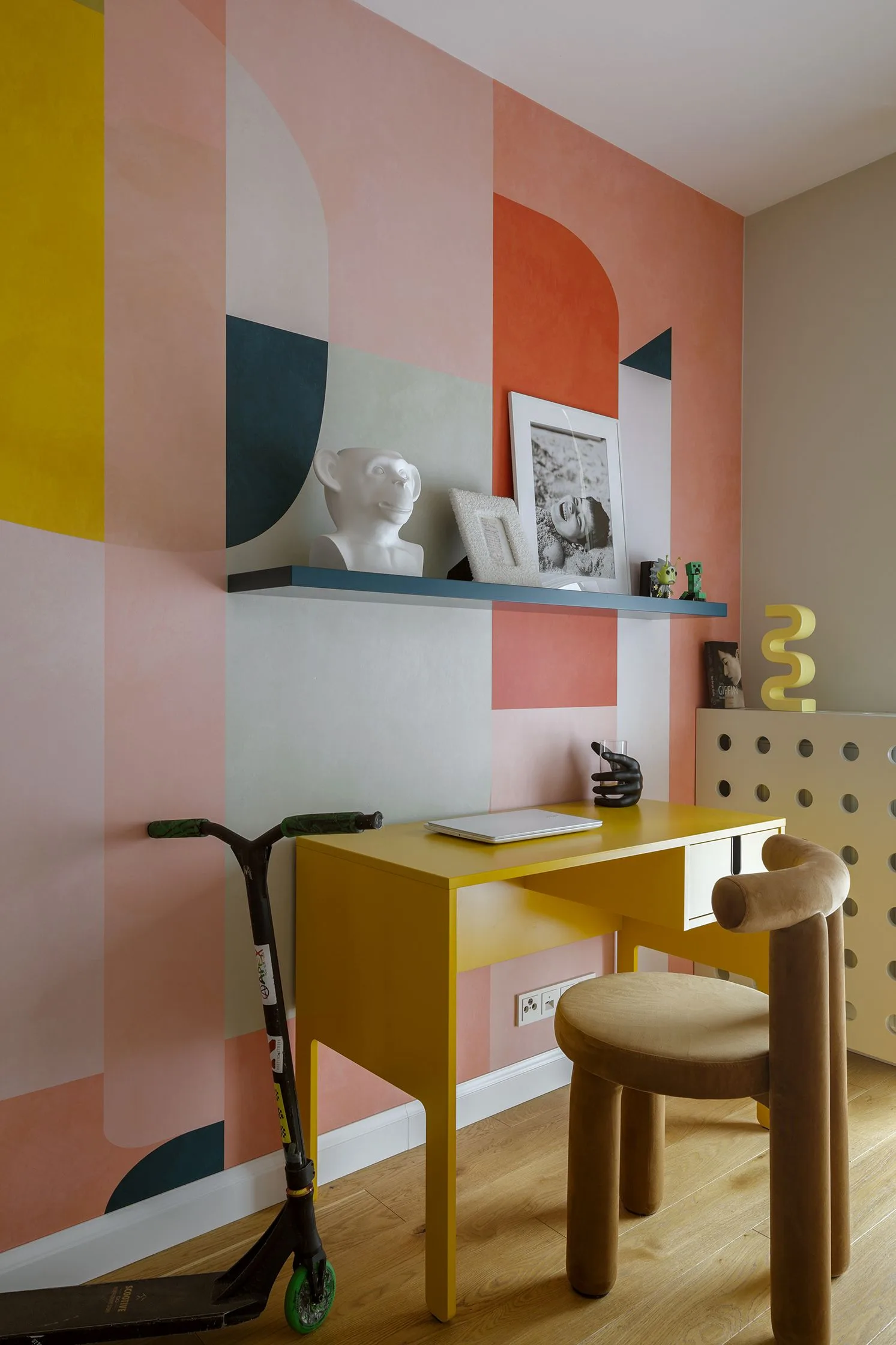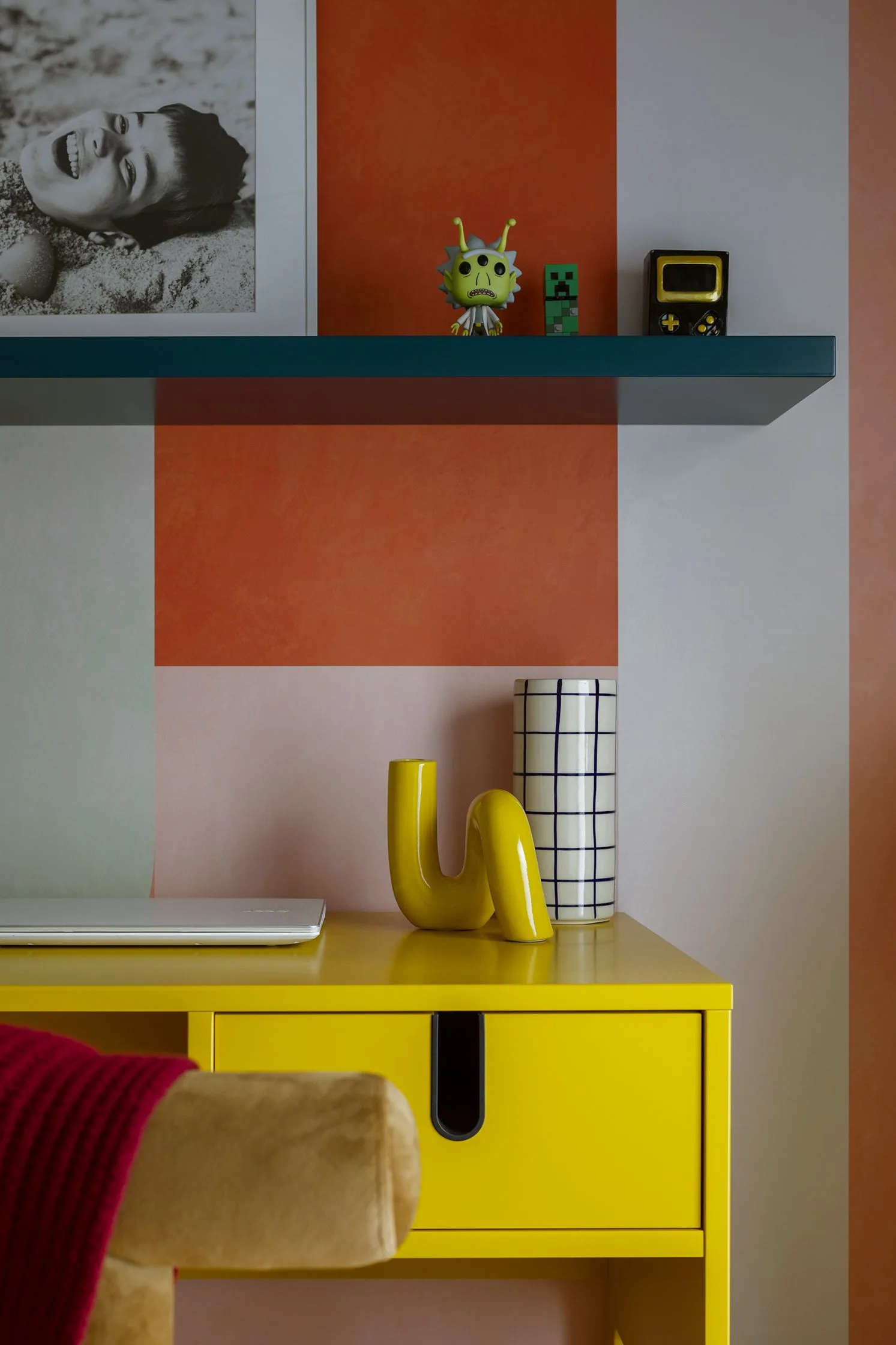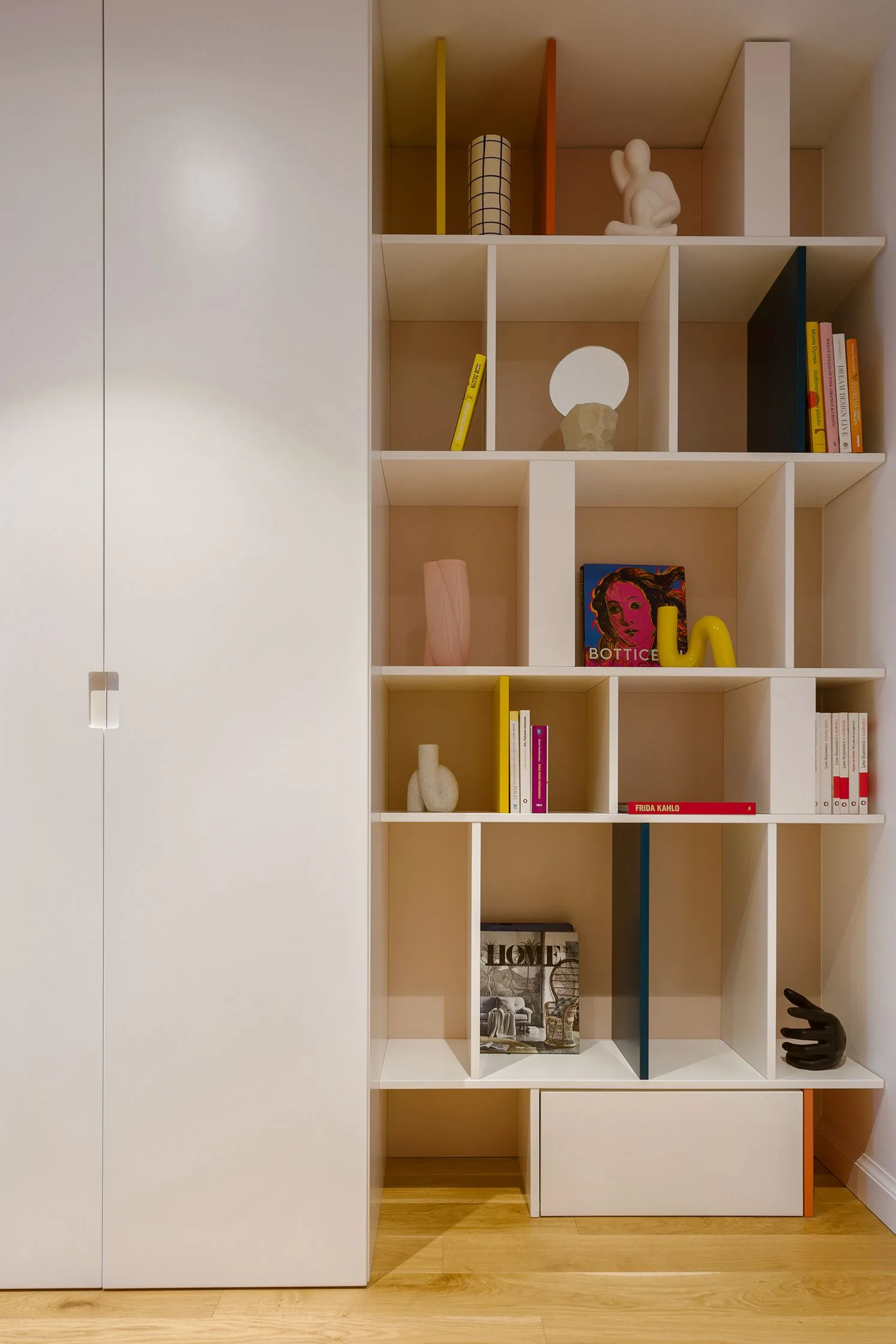 W drugim pokoju powstał domowy gabinet – miejsce do pracy i twórczych zajęć. Tutaj kolorystyka przybiera bardziej na sile prezentując geometryczne, pastelowe kształty bliskie stylowi Memphis. Kontrastująca, stonowana zabudowa koi wzrok, a różowe akcenty w dodatkach dodają subtelnego, kobiecego tonu. Pomimo niewielkiego metrażu, udało się zachować poczucie przestronności dzięki jasnym powierzchniom i lekkim meblom o ażurowej formie.