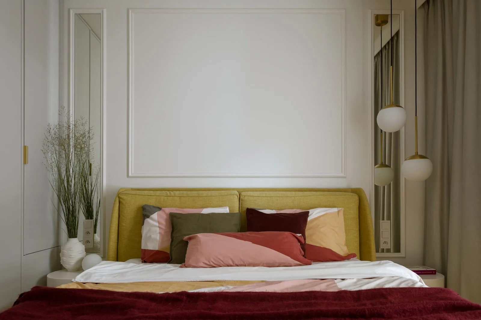 Sypialnia to najbardziej intymna część mieszkania – spokojna, ale niepozbawiona charakteru. Odcienie beżu i różu tworzą ciepły kokon, który sprzyja odpoczynkowi. Wzrok przyciągają detale: złote uchwyty, delikatne oświetlenie punktowe i kolejny, tym razem ręcznie malowany motyw na ścianie.