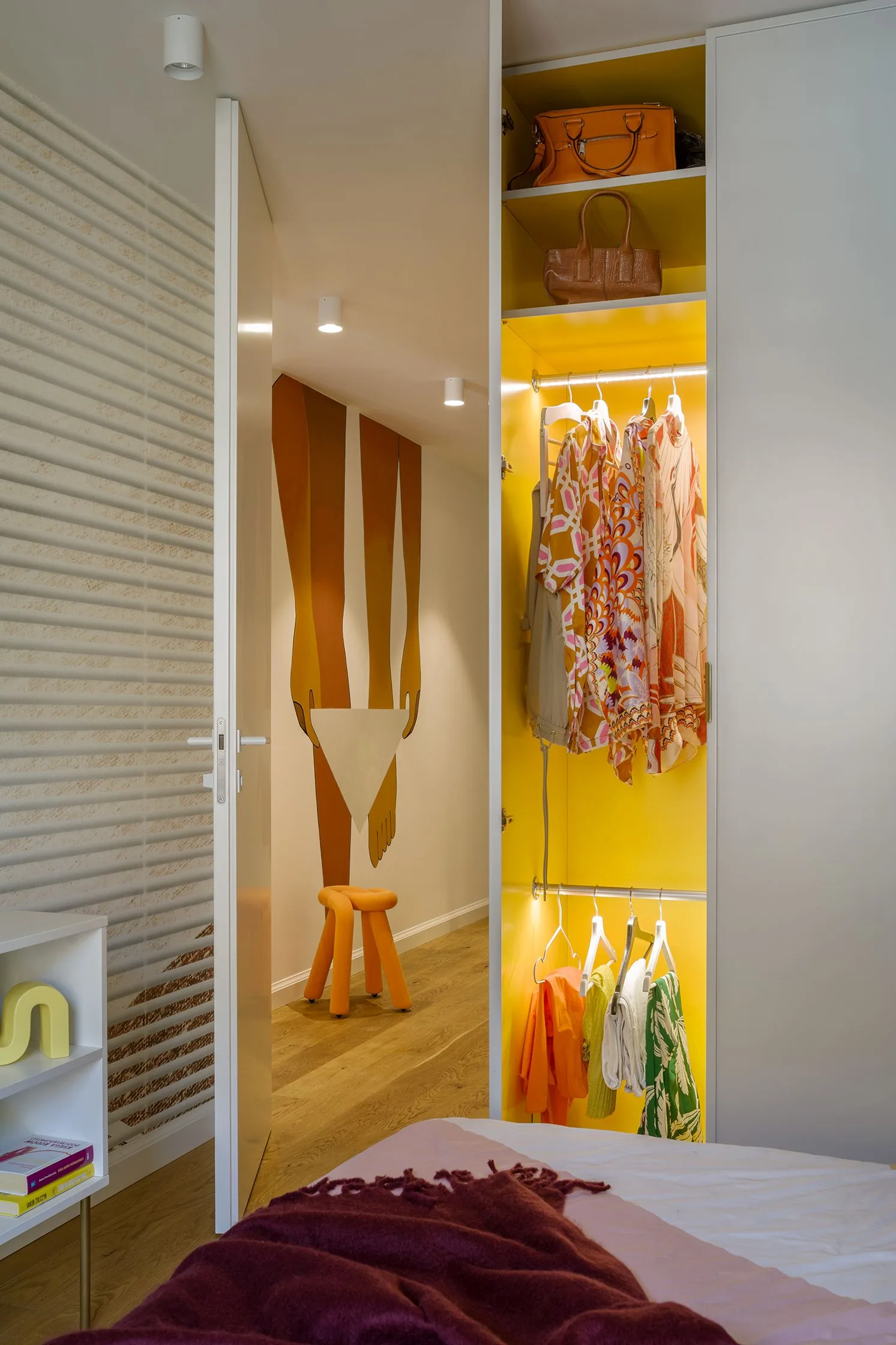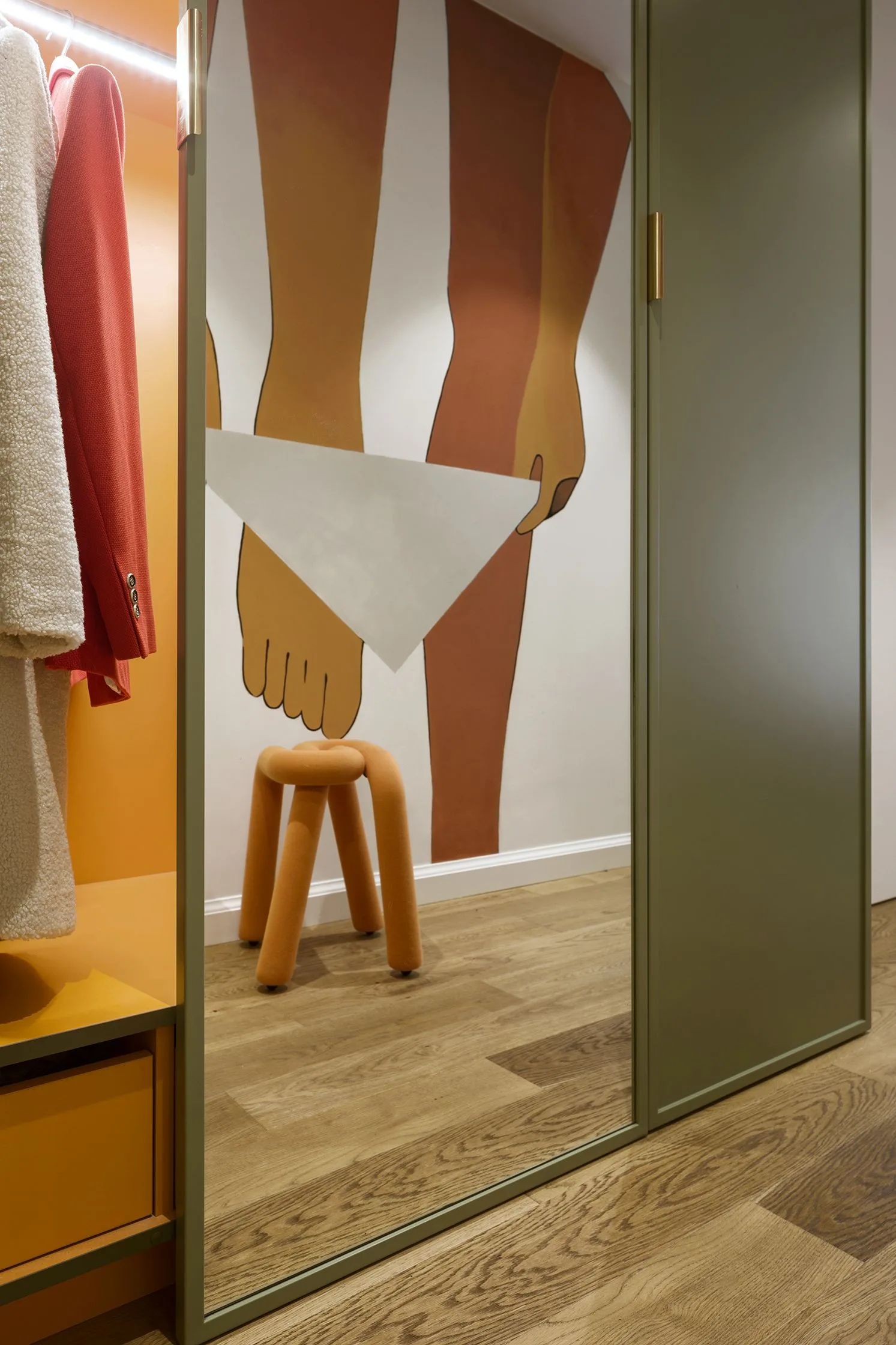 – W Polsce mamy zbyt wiele dni pozbawionych słońca, dlatego chciałam, żeby kolory dodawały mi energii – mówi inwestorka. Architektka z Tilla Architects postawiła więc na odważną paletę barw: pomarańcz, róż i zieleń, przełamaną złamaną bielą i szarością lastryko. Już od progu uwagę przykuwa mural w strefie wejściowej – abstrakcyjny, pełen życia i ruchu, stanowiący zapowiedź dalszej opowieści o wnętrzu.