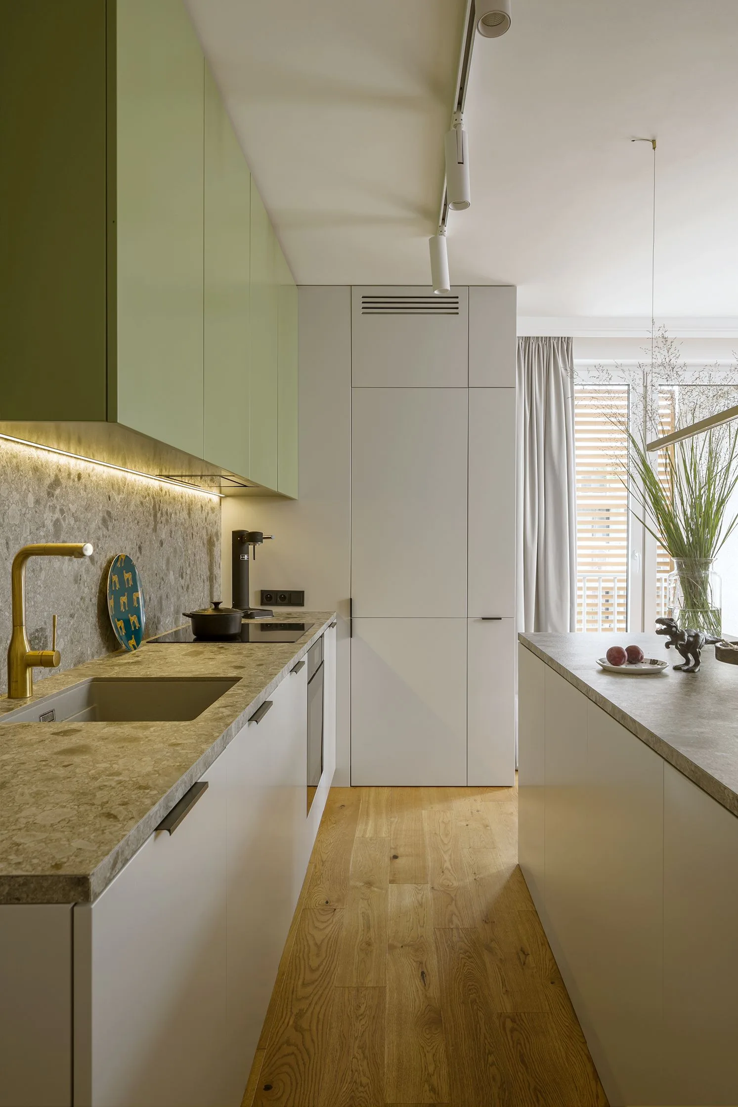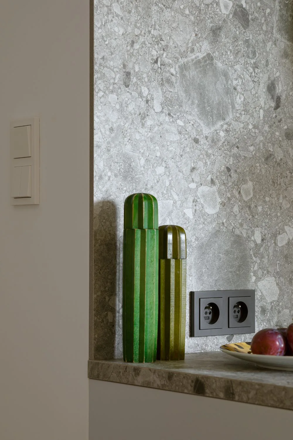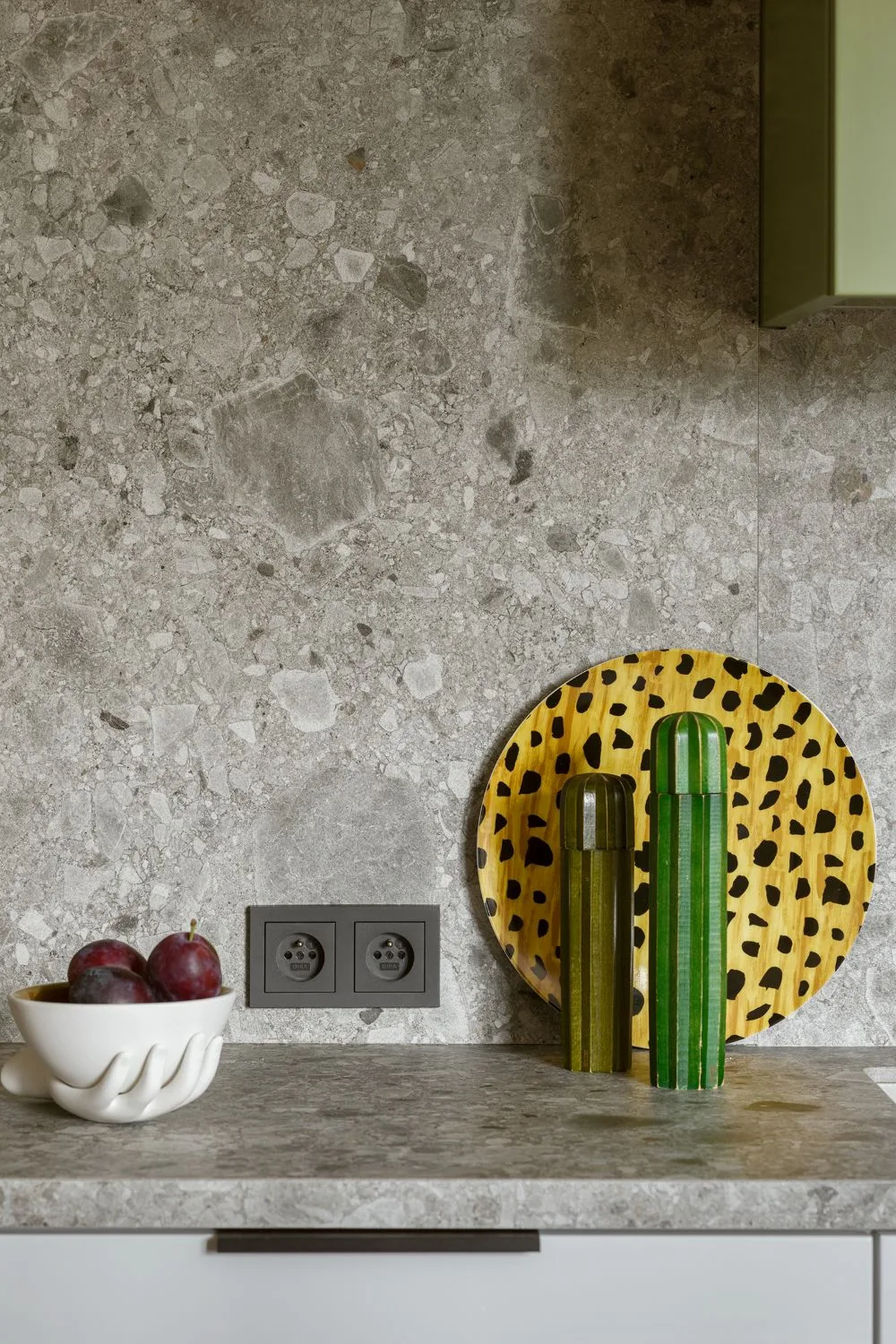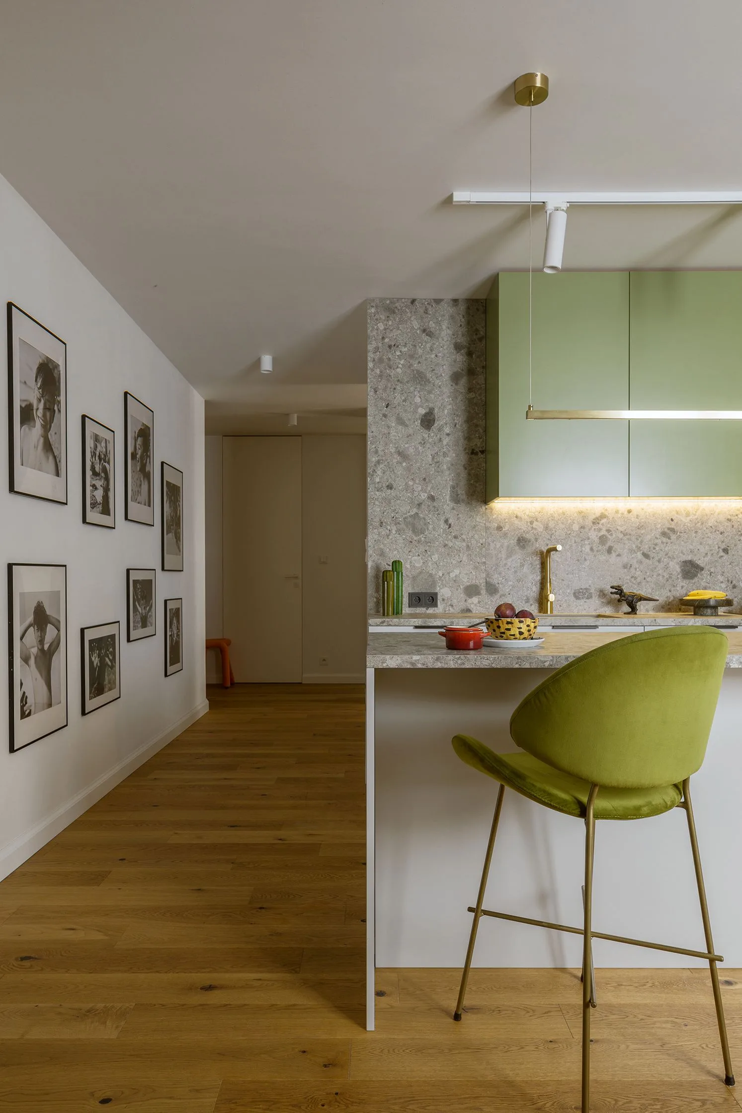 Ta kolorystyczna odwaga nie jest jednak chaotyczna. Każdy ton ma tu swoje miejsce i uzasadnienie. Oliwkowa kuchnia została zestawiona z jasną szarością i lastryko, co łagodzi intensywność barw, a jednocześnie podkreśla ich świeżość. Subtelne detale – jak czarno-biały osprzęt Gira, harmonizujący z kolorystyką ścian i frontów – dodają kompozycji wyważonej elegancji. To właśnie takie drobiazgi budują spójność projektu, sprawiając, że wnętrze jest zarówno pełne energii, jak i wizualnie uporządkowane.