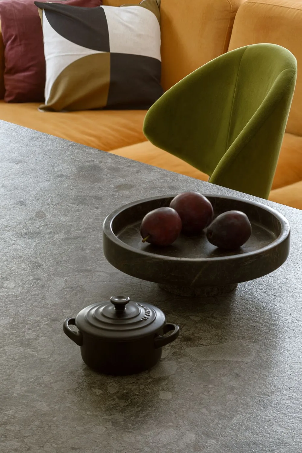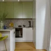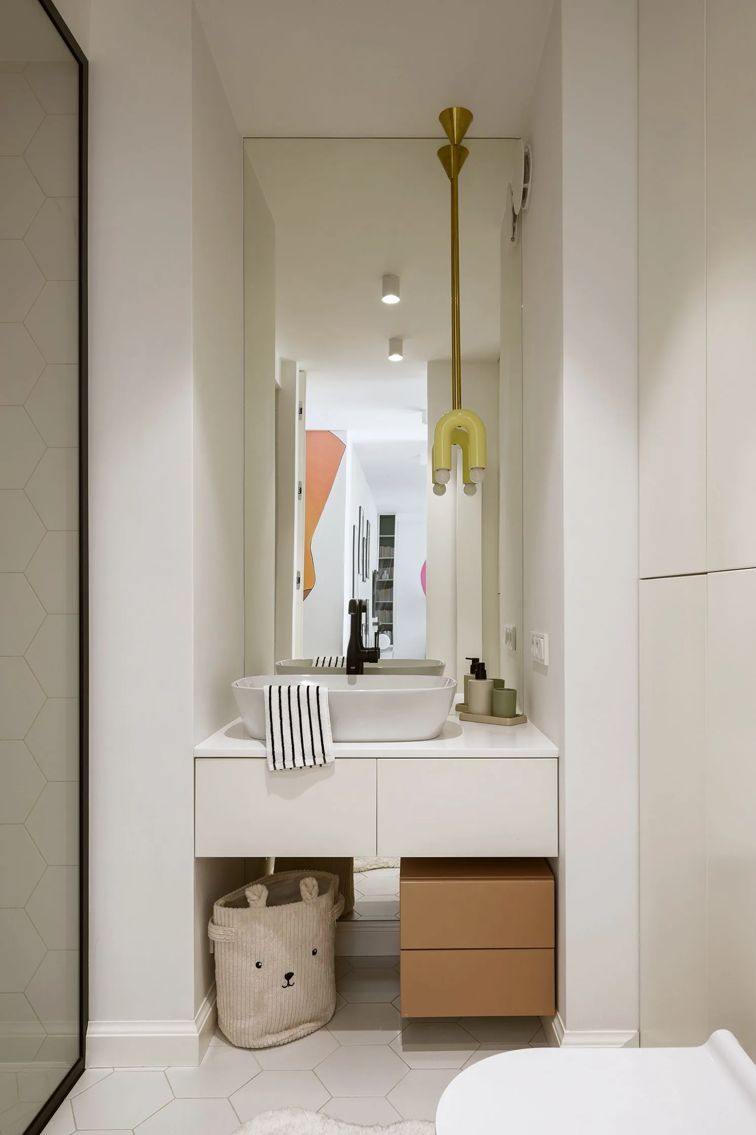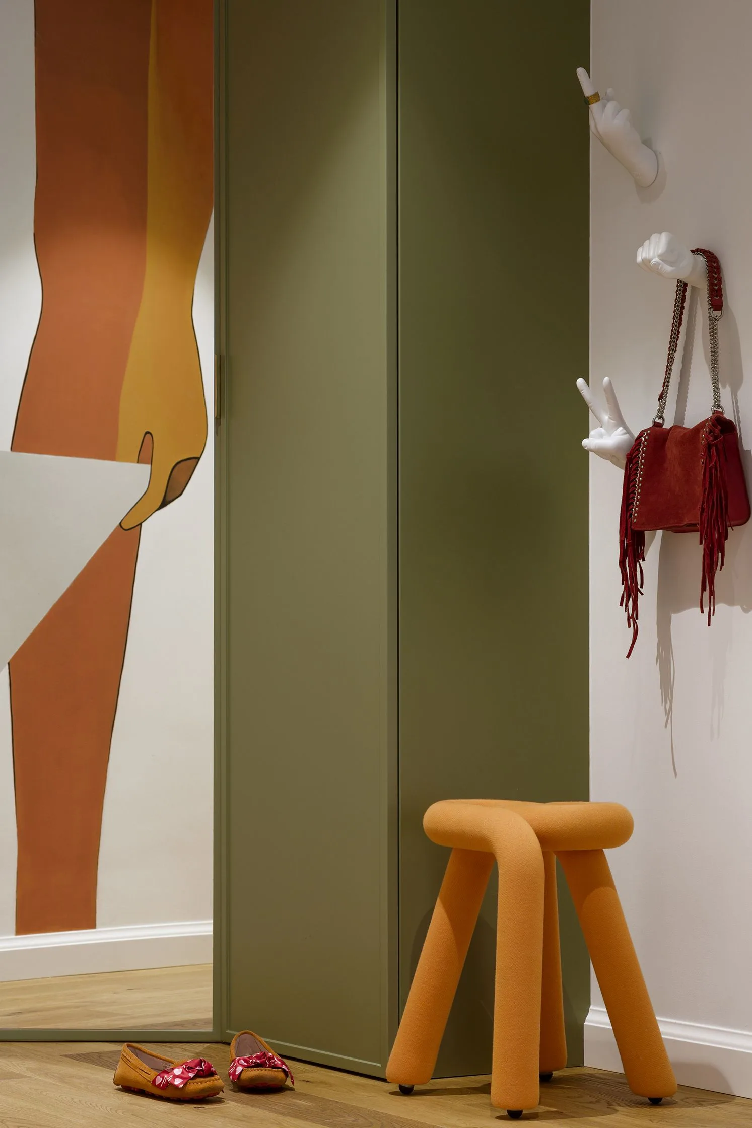Ta kolorystyczna odwaga nie jest jednak chaotyczna. Każdy ton ma tu swoje miejsce i uzasadnienie. Oliwkowa kuchnia została zestawiona z jasną szarością i lastryko, co łagodzi intensywność barw, a jednocześnie podkreśla ich świeżość. Subtelne detale – jak czarno-biały osprzęt Gira, harmonizujący z kolorystyką ścian i frontów – dodają kompozycji wyważonej elegancji. To właśnie takie drobiazgi budują spójność projektu, sprawiając, że wnętrze jest zarówno pełne energii, jak i wizualnie uporządkowane.