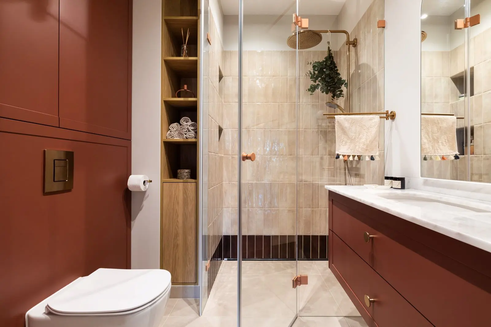 Dla równowagi w łazience, wybrano wyrazisty bordowy kolor, który nadaje mieszkaniu pikanterii. Stonowany został on piaskową podłogą i oryginalnymi szkliwionymi płytkami na ścianach. Warto zwrócić uwagę na detale, jak okucia oraz grzejnik w kolorze brzoskwiniowym oraz armaturę w odcieniu szczotkowanego złota. Wszystkie te elementy tworzą piękną, spójną przestrzeń stworzoną do długiego relaksu.