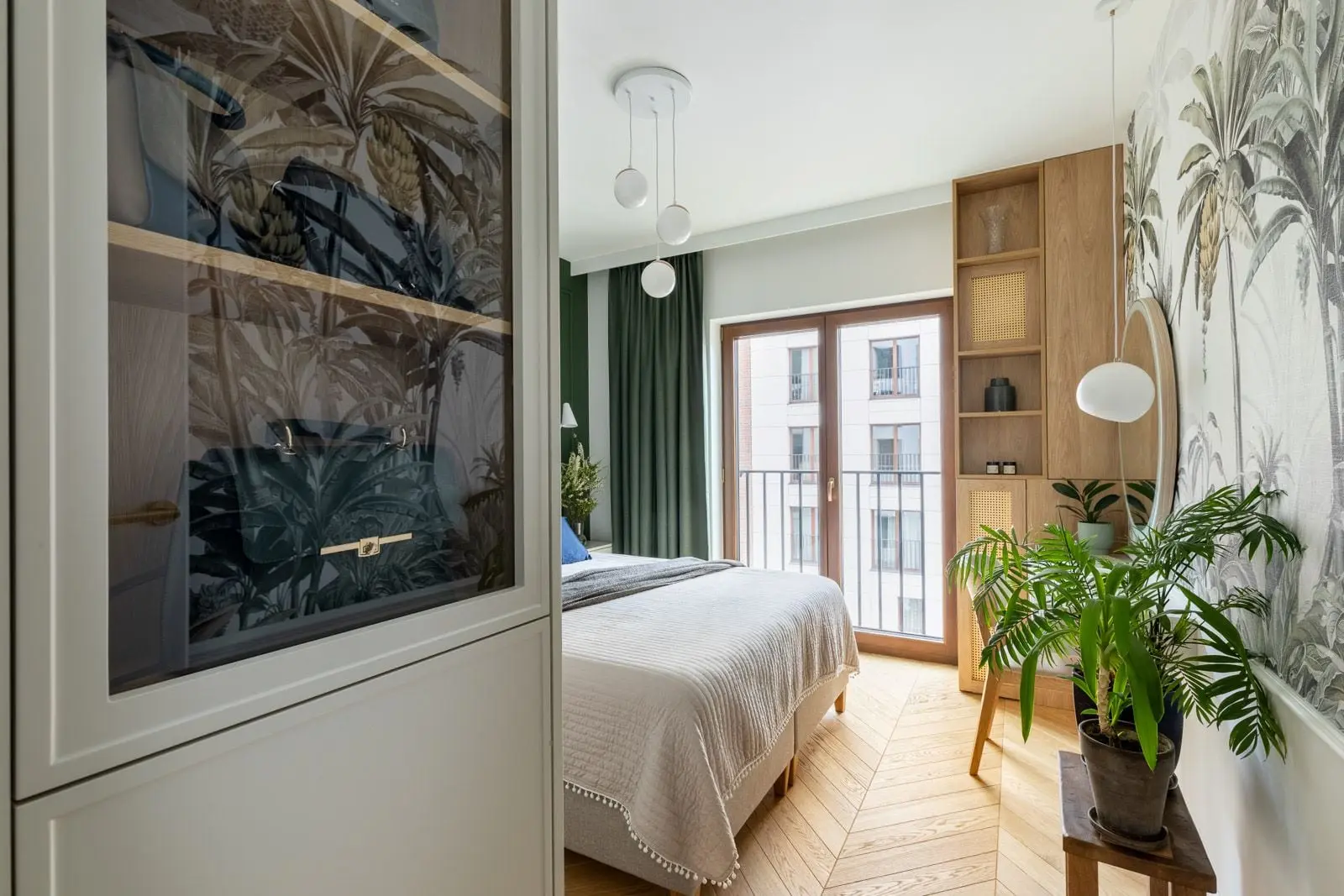 W pokoju obok, znajduje się kojąca sypialnia ze ścianą i zasłonami w głębokim zielonym kolorze. Dzięki zastosowaniu delikatnej sztukaterii i tapety z motywem tropikalnym uzyskano zestawienie, które przywodzi nam na myśl nigdy niekończące się wakacje. Zabudowa grzejnika z lekką plecionką wiedeńską oraz zgaszony biały odcień szafy i toaletki równoważy wyrazisty wzór tapety oraz intensywny kolor ściany.