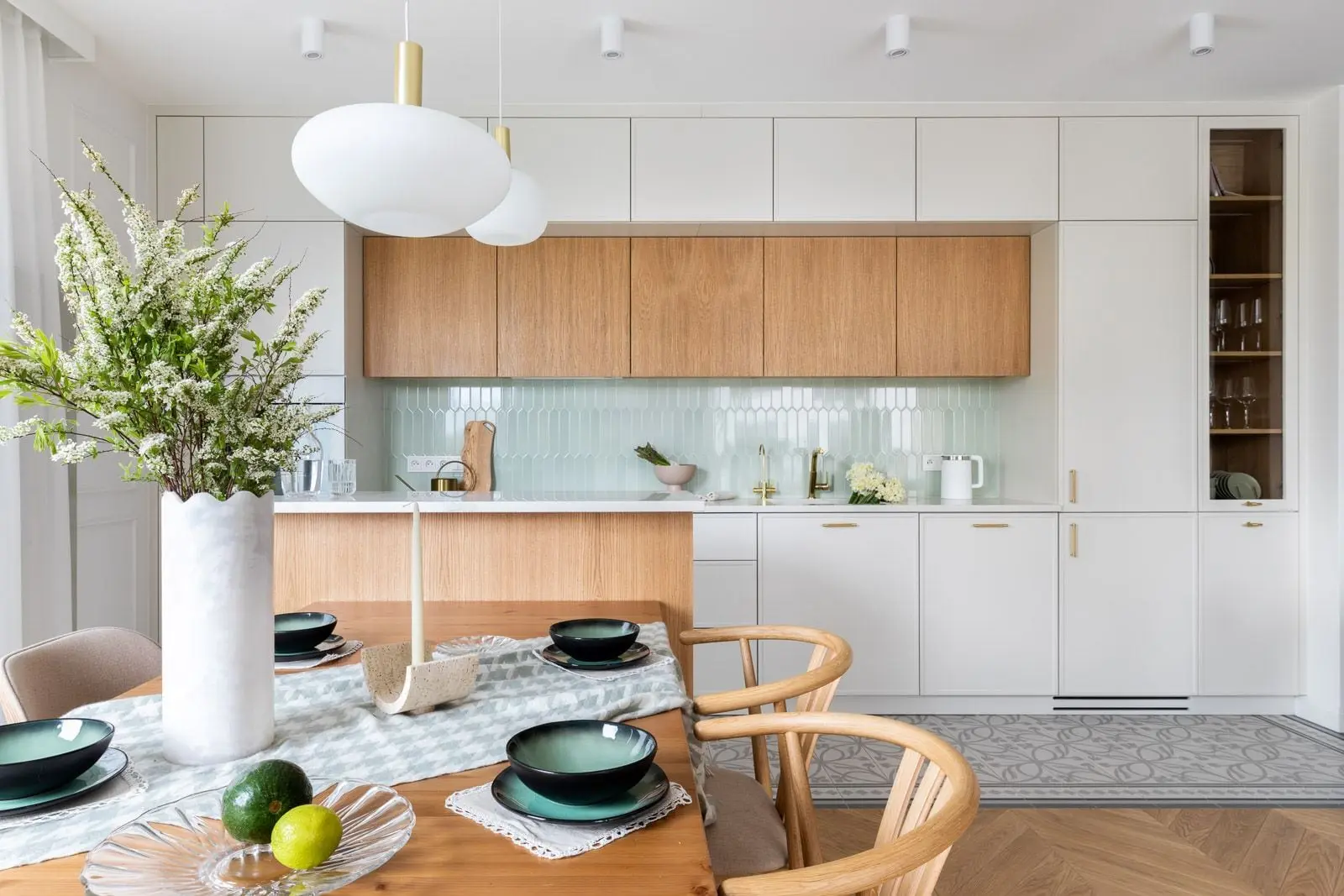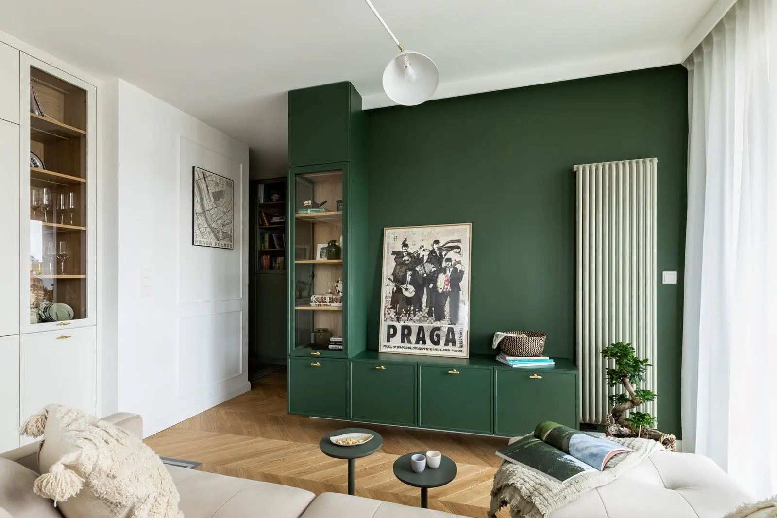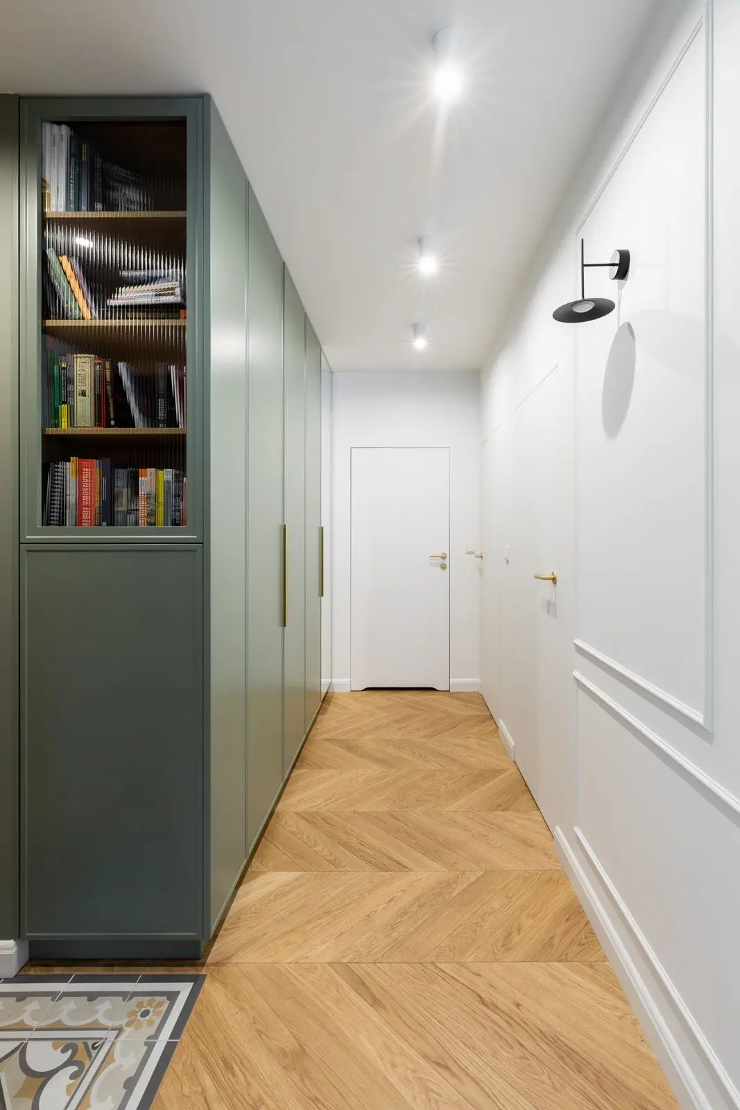 Połączenie klasycznych wzorów, delikatnej sztukaterii i oryginalny dobór kolorów od razu wywołuje uczucie ciepła i komfortu, jednoczenie solidnie osadzając nas w nowoczesnej rzeczywistości. Po wejściu do mieszkania zwracają na siebie uwagę płytki podłogowe tworzące kwiatowy, geometryczny wzór. Oryginalny odcień zieleni na ścianach, ukryte drzwi do pomieszczeń oraz funkcjonalna, drewniana zabudowa stolarska zapowiadają wyjątkowe wrażenia.
