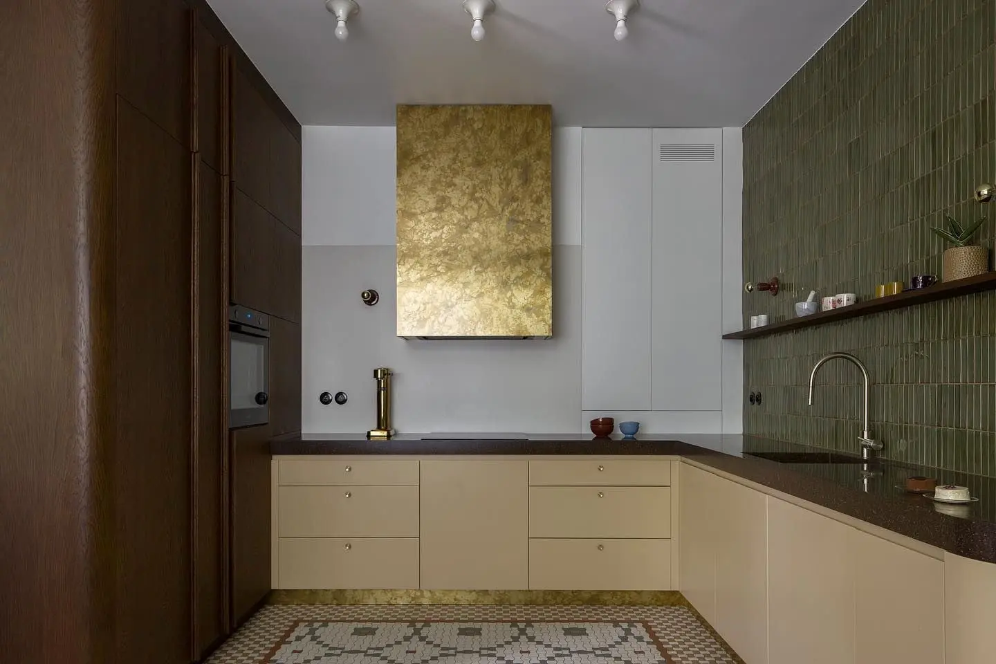 Zabudowy meblowe wykonane przez stolarza mają kolor budyniowy, odnalazły one niezwykłe porozumienie z zielonymi płytkami typu kit-ket, brązami, które nadają powagi oraz elementami złota, którego nie mogło zabraknąć. Meble w kolorze budyniowym, jak się okazało to doskonały wybór, który tworzy eleganckie i stonowane tło dla pozostałych elementów wystroju kuchni. Kolor ten jest uniwersalny i pasuje zarówno do nowoczesnych, jak i klasycznych aranżacji. Złote elementy dodają blasku, a z gorsecikami na podłodze tworzą niezwykły duet. Elementy te są wisienką na torcie. Dodają blasku i luksusu, tworząc wrażenie wyjątkowego miejsca.