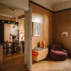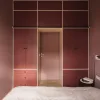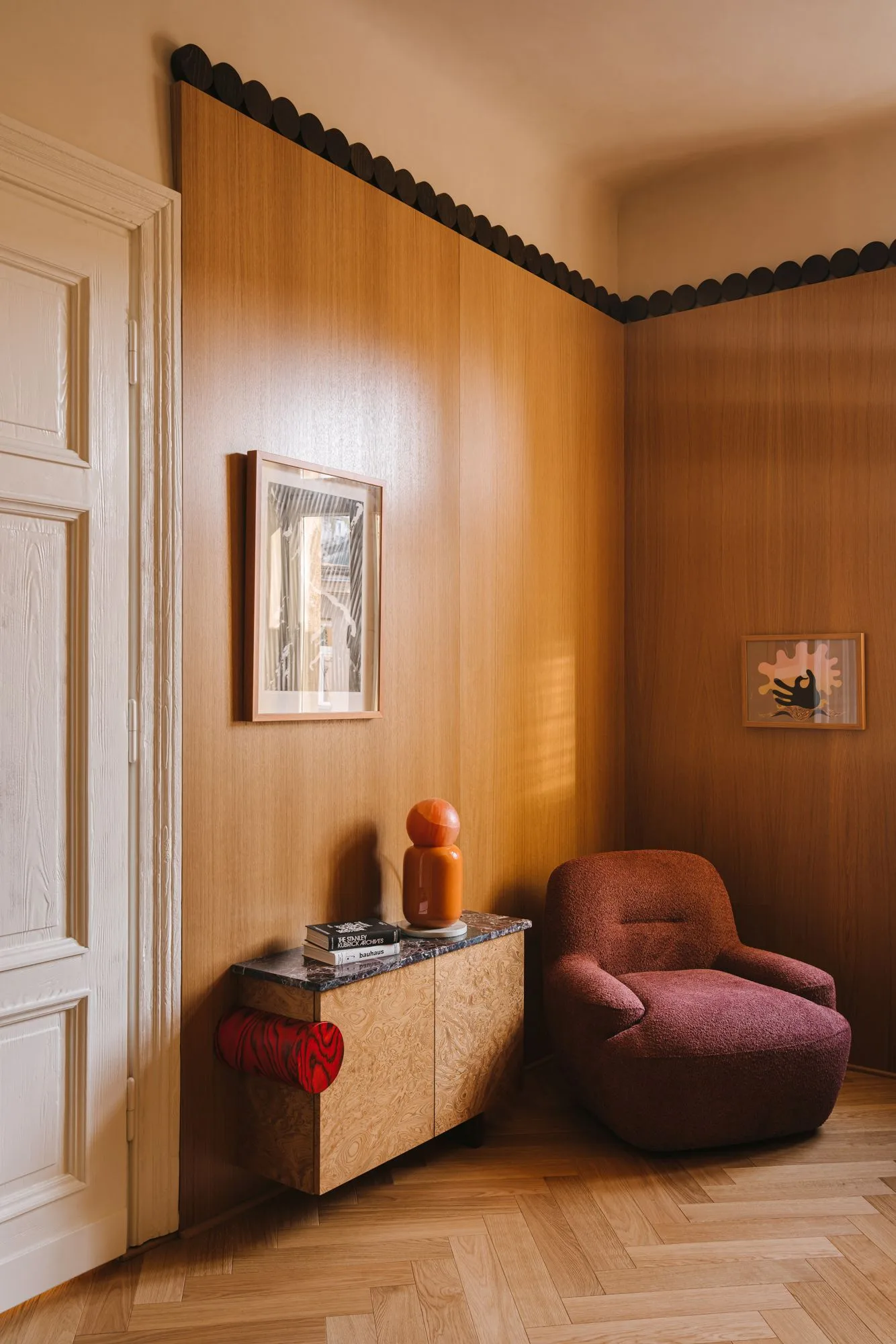 Gabinet zaprojektowano jak drewniane pudełko z wyraźnym gzymsem; ta niemal „zamknięta” przestrzeń sprzyja skupieniu i pracy koncepcyjnej. Sypialnia opowiada inną historię – to kompozycja fioletów o lekko barokowym rodowodzie, połączonych z piaskową wykładziną oraz motywem szachownicy, który płynnie przechodzi na sufit, otulając użytkowników kolorem i wzorem.