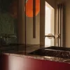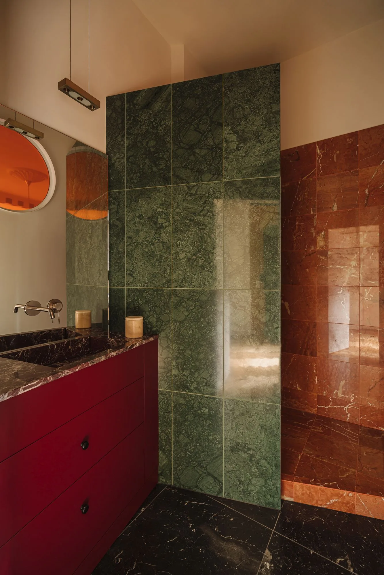 Łazienka to z kolei celebracja kamienia w jego najbardziej zmysłowej odsłonie. Zestawienie Verde Guatemala, Rojo Alicante i Rosso Levanto tworzy intensywną, odważną kompozycję, w której kolory i użylenia przenikają się niczym abstrakcyjne obrazy.