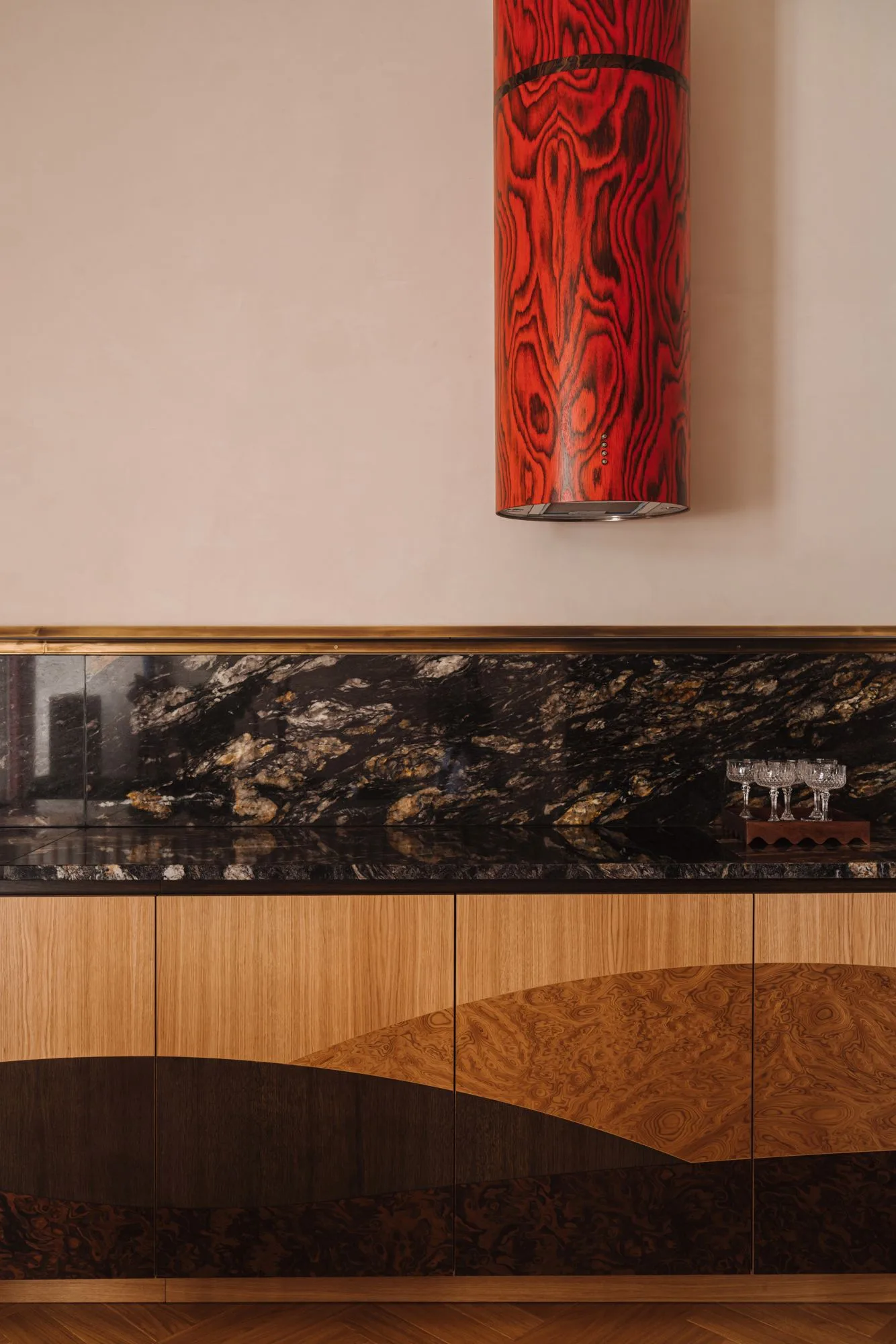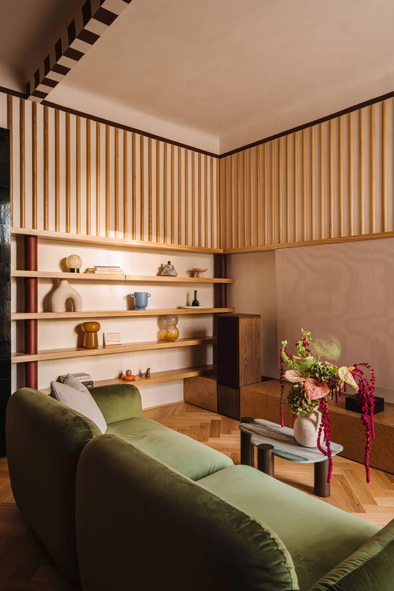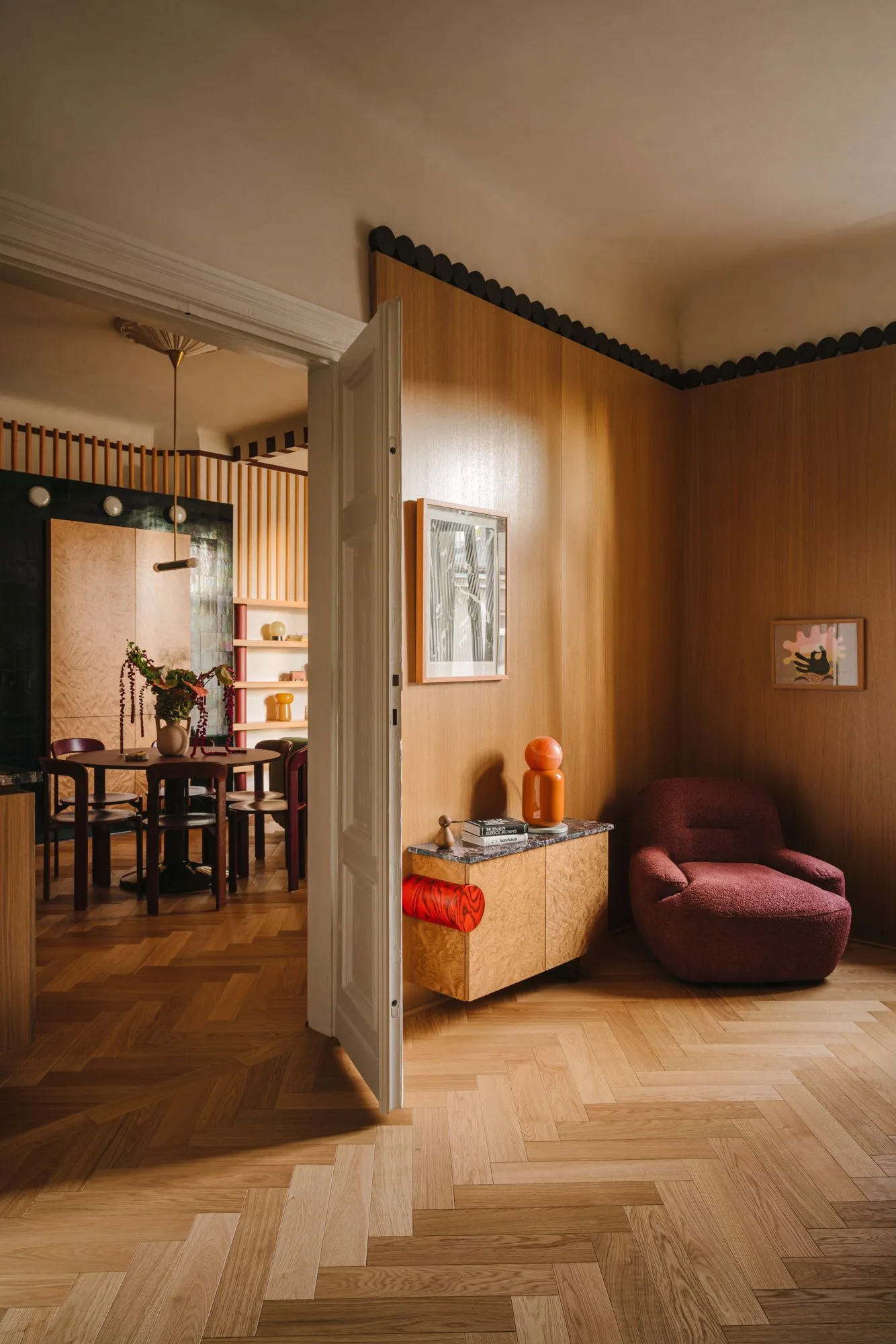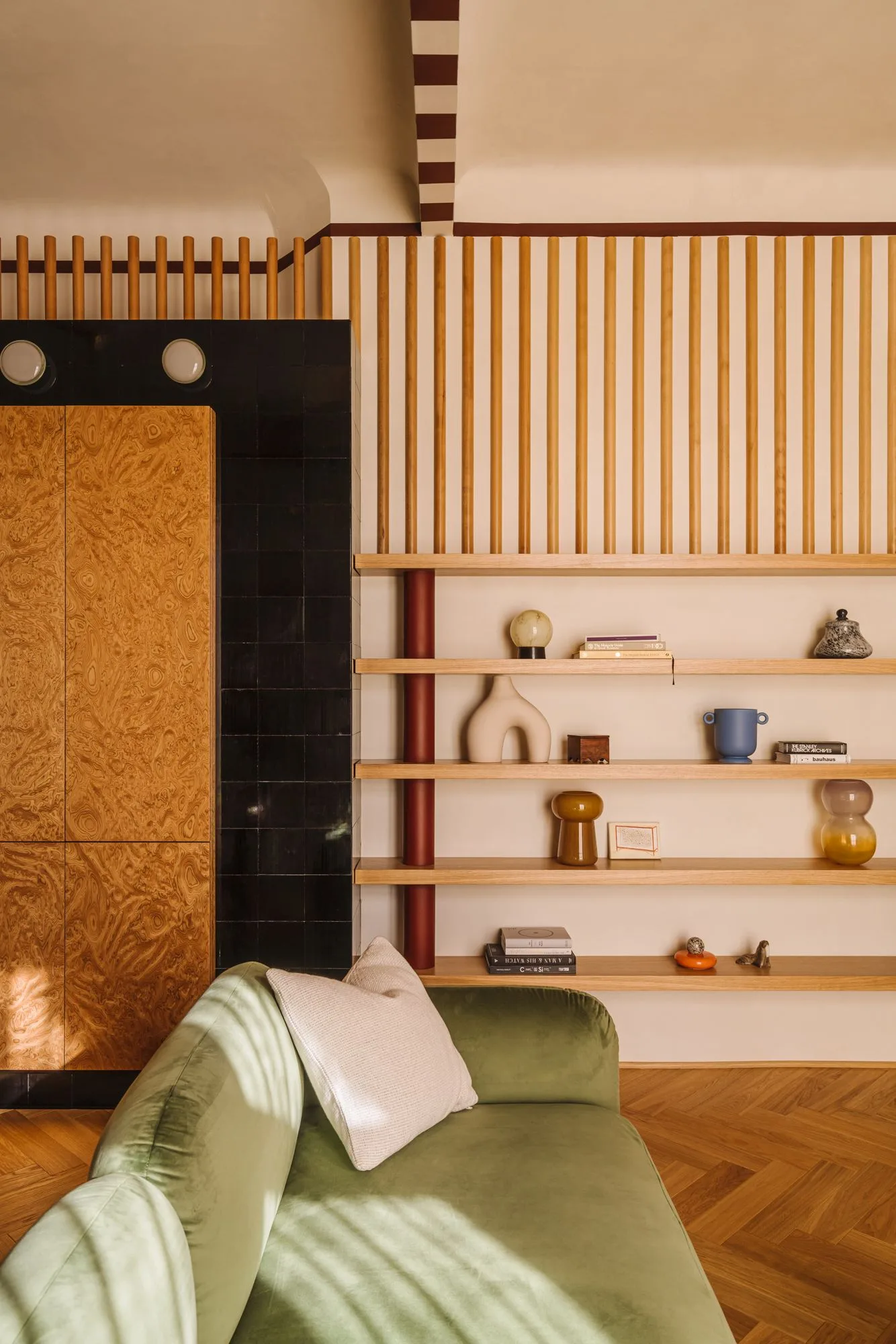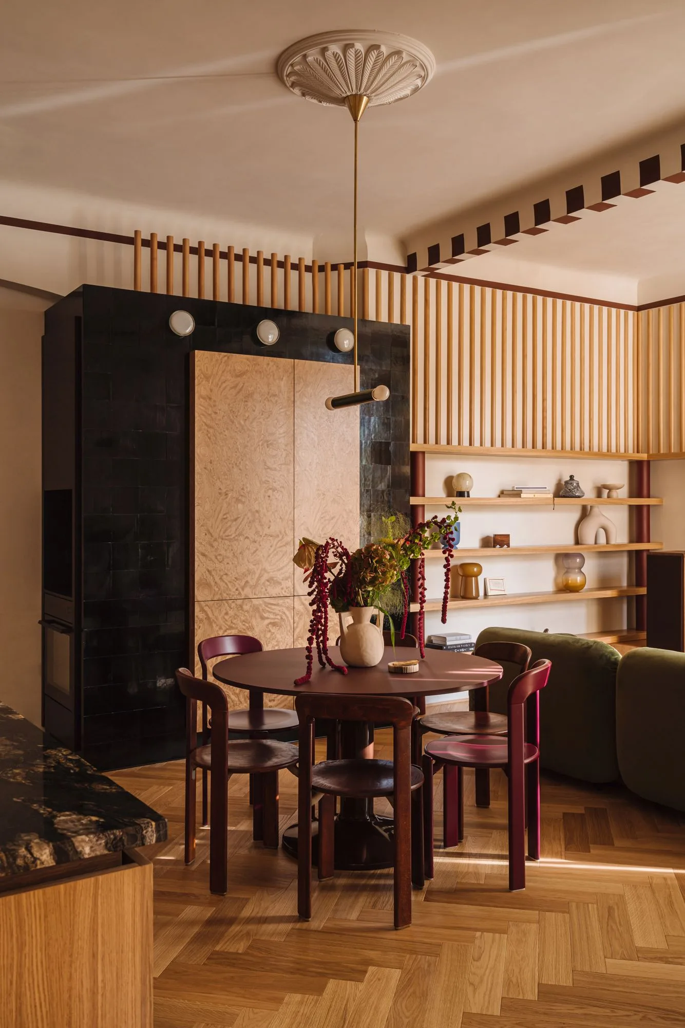 Założeniem projektowym było stworzenie miejsca, które zostaje w pamięci – nie przez jedną mocną dekorację, ale przez przenikanie się planów, materiałów i barw. Mieszkanie wymyka się prostym określeniom stylistycznym. Obecne są tu inspiracje różnymi epokami i technikami rzemieślniczymi, ale ujęte we współczesnej formie: od szaf wykończonych oryginalnymi, czarnymi, emaliowanymi płytkami z lat 60., po fronty kuchenne nawiązujące do klasycznej intarsji.