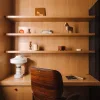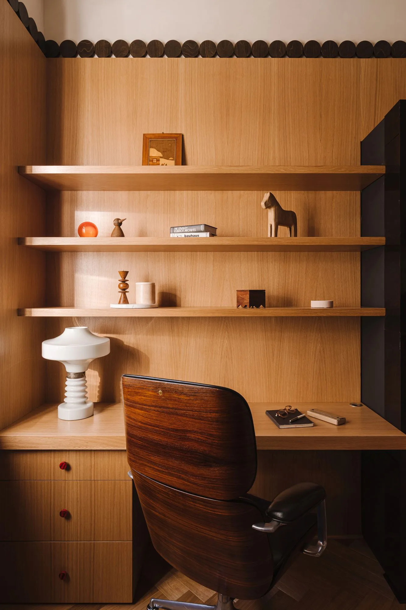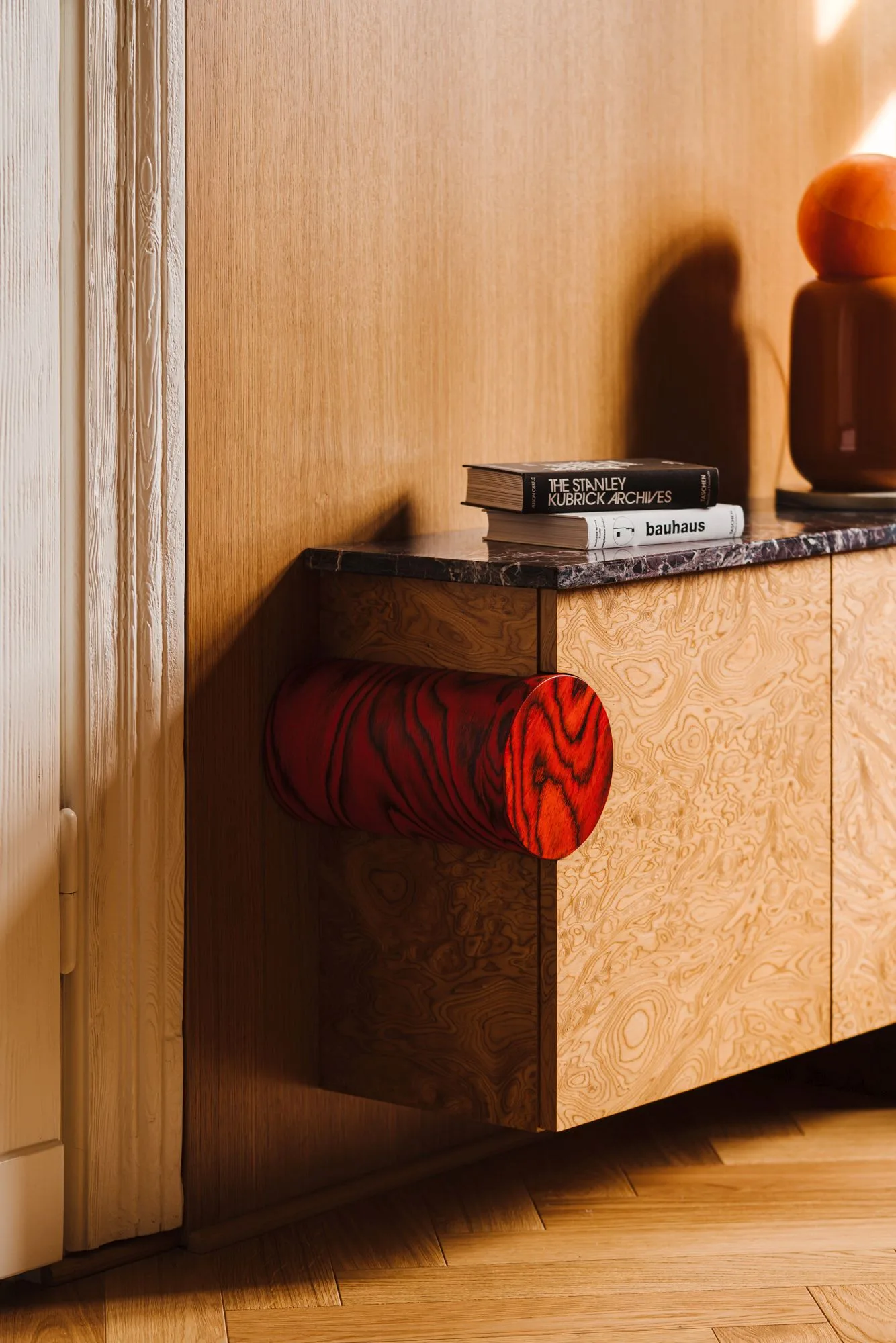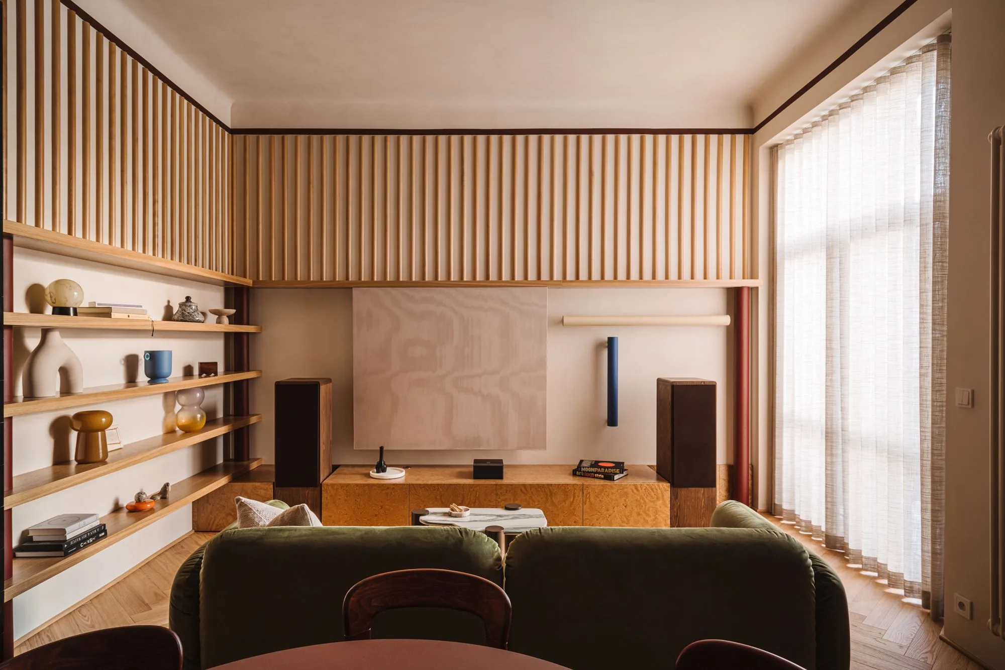 Paleta kolorystyczna bazuje na naturalnych odcieniach drewna oraz subtelnych, beżowych ścianach o lekko przetartej strukturze. Na tym spokojnym tle wyraźnie wybrzmiewają mocniejsze akcenty: pomarańczowy świetlik, czerwony obudowany okap oraz oliwkowa, welurowa sofa marki Calligaris. Całość porządkuje oraz ociepla raster dębowych półwałków, które wprowadzają architektoniczny rytm i dodają wnętrzu taktylnej głębi.