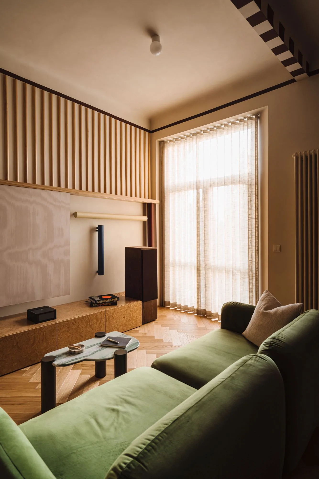To przestrzeń, w której materiały prowadzą ze sobą ciągły dialog – odbijają światło, zmieniają odcień w zależności od pory dnia, reagują na dotyk. Wraz z codziennym użytkowaniem mieszkania ta opowieść wciąż się rozwija, a jego mieszkańcy stają się współautorami historii wpisanej w mury ponad stuletniej kamienicy.
