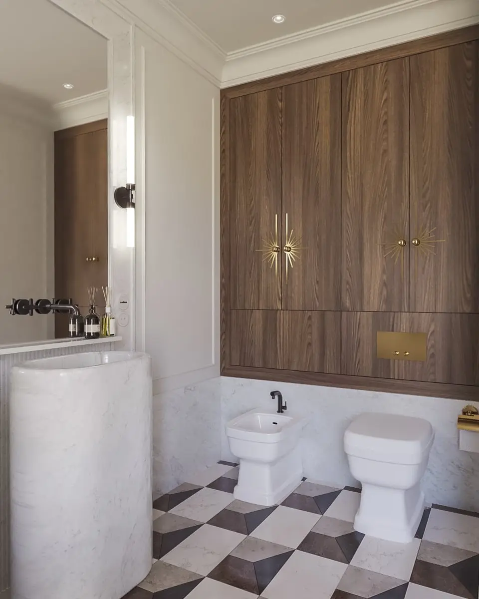 Z głównej sypialni przechodzimy bezpośrednio do prywatnej łazienki, która podobnie jak pozostała część mieszkania utrzymana jest w odcieniach złamanej bieli. Kontrast stanowi posadzka z kamienia ułożonego w geometryczny, powtarzalny wzór. W projekcie są wykorzystane naturalne, szlachetne materiały, takie jak marmur i drewno. Wolnostojąca wanna i umywalki o prostej, obłej formie nadają wnętrzu elegancji. Funkcję przechowywania pełni duża szafka sprytnie ukryta nad zabudową toalety.