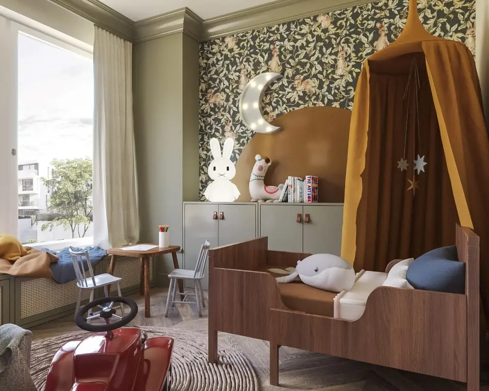 Projekt pokoju dziecka odbiega od jasnej kolorystyki mieszkania. Wnętrze utrzymane jest w odcieniach zgaszonej, szałwiowej zieleni. Urocza tapeta w leśny wzór sprawia, że wnętrze jest nie tylko magiczne, ale też czuć w nim ducha retro. W pokoju znajduje się pojemna, ale lekka w formie szafa na ubrania, szafki na wszystkie dziecięce skarby zlokalizowana w dolnej części ściany, aby mały odkrywca mógł sam po nie sięgać oraz stolik do rysowania i rosnące wraz z dzieckiem łóżeczko.