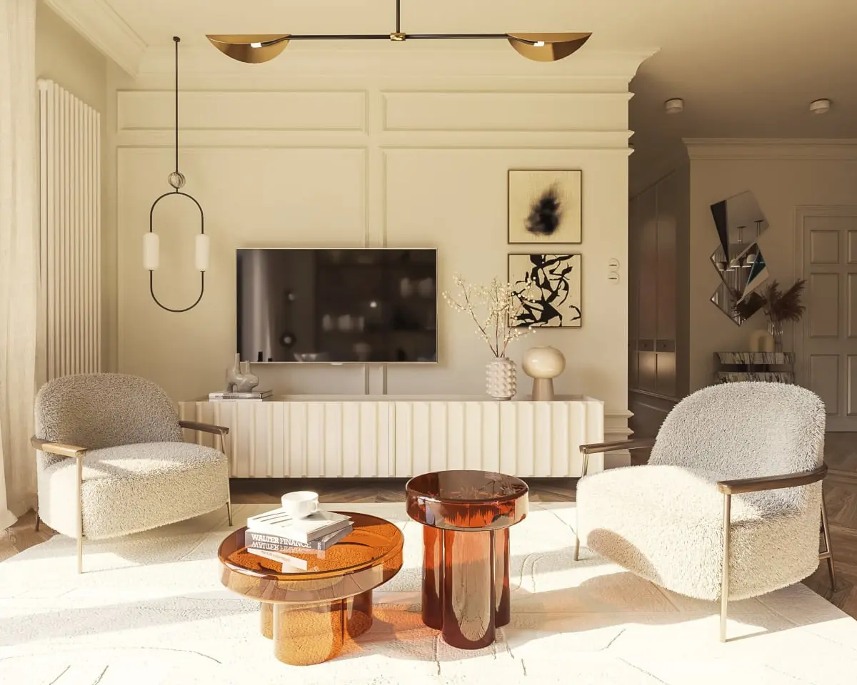W salonie główną rolę odgrywa światło. Jego naturalne piękno uwydatniają liczne szklane i lustrzane elementy wystroju, takie jak stoliki kawowe oraz lustro pięknie odbijające refleksy światła. Fotele i sofa są wykończone jasnymi tkaninami. Parkiet w jodełkę, sztukaterie oraz złote detale w prostej formie sprawiają, że wnętrze nieco nawiązuje do francuskich garsonier. Tę elegancką kompozycję przełamują szklane stoliki w bursztynowym kolorze a mięsisty, strukturalny dywan nadaje całości domowego ciepła.