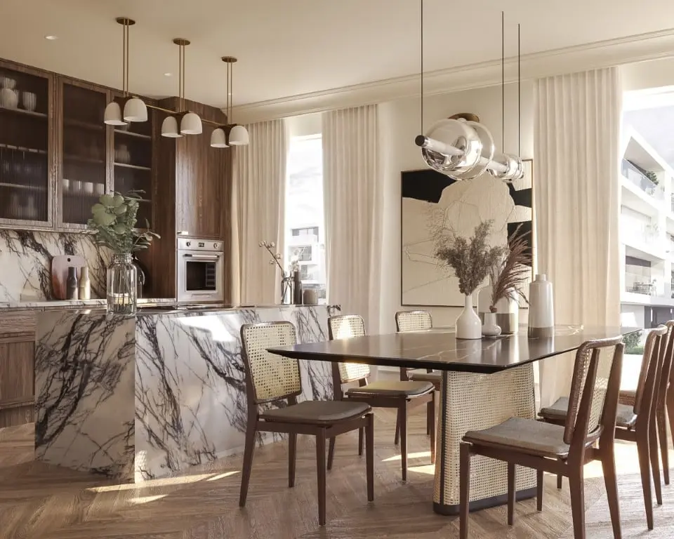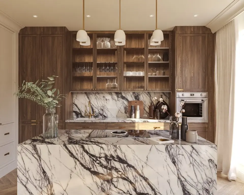 Z wyrazistym rysunkiem kamienia pięknie kontrastuje fornir w kolorze orzecha zastosowany na frontach kuchennych. Takie połączenie sprawia, że kuchnia nie powiela schematów – prezentuje swój odrębny styl mocno balansujący pomiędzy klasyką a awangardą. Architekci wprowadzili do projektu również bardziej nowoczesny akcent w postaci szkła ryflowanego, z którego są wykonane przeszklone fronty szafek wiszących. Okap został umieszczony w płycie kuchennej. Dzięki temu nad wyspą mogła zabłysnąć efektowna lampa. Lodówka do zabudowy i miejsce do przechowywania znajdują się w szafkach wykończonych szaro – beżowym lakierem. Jak mówią architekci, takie zróżnicowanie frontów daje wrażenie liniowej, symetrycznej kuchni.