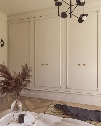 Zabudowa stolarska w sypialni, poza dużą i funkcjonalną przestrzenią do przechowywania ubrań, kryje w sobie drzwi. Od strony części dziennej wejście jest podkreślone bordowym łukiem, natomiast w sypialni drzwi zlewają się z frontami szafy, tworząc spójną zabudowę. Fronty zostały pomalowane na ten sam kolor, co ściany. Pojawia się na nich również sztukateria, która sprawia, że garderoba wtapia się w tło. Czarne lampy Aromas del Campo subtelnie kontrastują z jasnym wnętrzem i prezentują się niczym delikatne rzeźby.