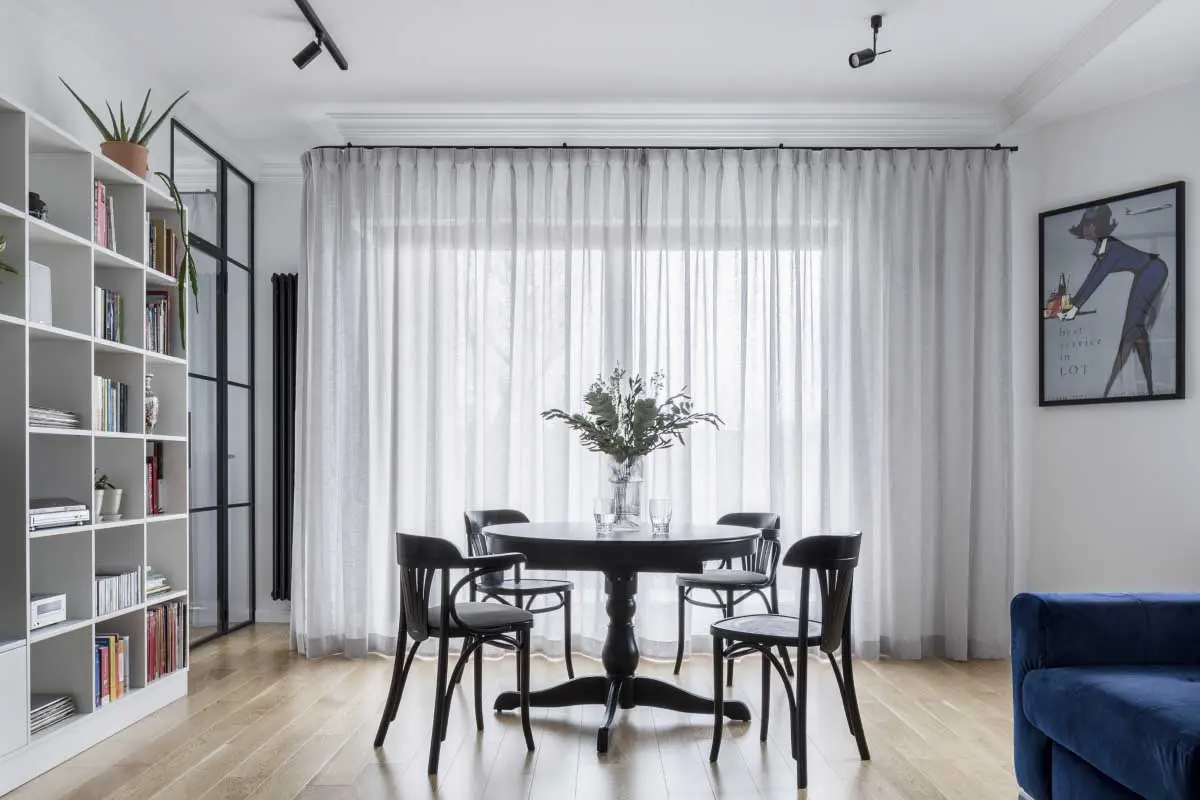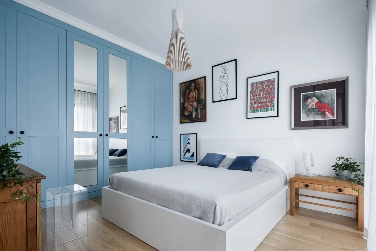 Aranżacja wnętrza miała nawiązywać do stylistyki skandynawskiej, stąd dominująca rola bieli i szarości. Natomiast by nadać całości bardziej indywidualnego charakteru, zdecydowano się na wprowadzenie motywu kolorystycznego w postaci błękitu. Pojawia się on w różnych odcieniach i stanowi leitmotiv we wszystkich pomieszczeniach. Sofa w części dziennej, ma piękne welurowe obicie w kolorze Classic Blue. Nawiązanie do barwy przewodniej widoczne jest również w oryginalnych grafikach, dekorujących ściany salonu. Pastelowa wersja błękitu została wykorzystana w zabudowie szafy, znajdującej się w sypialni. Otrzymano w ten sposób barwną ścianę, która wprowadza do wnętrza atmosferę relaksu. Natomiast w łazience odcień baby blue pokrywa fronty szafek. Kontrastem wobec jasnej palety barwnej mieszkania są czarne elementy: stalowe ramy drzwi, uchwyty meblowe, oświetlenie natynkowe oraz lodówka nawiązująca do stylistyki retro.