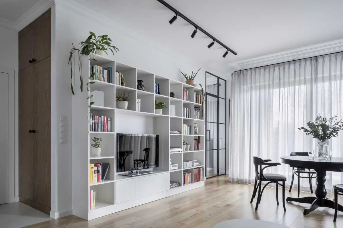 Pierwotne drzwi do sypialni zostały zamurowane, dzięki czemu w przedpokoju zmieściła się duża szafa. Natomiast wejście przeniesiono do narożnika przy drzwiach balkonowych w salonie, co pozwoliło na zagospodarowanie jednego z problematycznych i niewykorzystanych wcześniej miejsc. Zastosowanie przeszklonego portalu na całej wysokości ściany, otwiera przestrzeń i dodatkowo doświetla zarówno sypialnie, jak i część dzienną. W rezultacie wnętrze wydaje się być bardziej przestronne i jasne. Drugi z niecodziennych narożników wnętrza, który znajduje się na przeciwko nowego wejścia do sypialni, został przeznaczony na miejsce do pracy. Ostry kąt zabudowano biurkiem na wymiar oraz półkami. Dzięki temu domowe biuro zostało naturalnie wydzielone z części dziennej. Kolejnym ciekawym rozwiązaniem, zastosowanym przez architektów jest ażurowe przepierzenie w formie pionowych „żyletek”, które subtelnie oddziela aneks kuchenny od salonu.