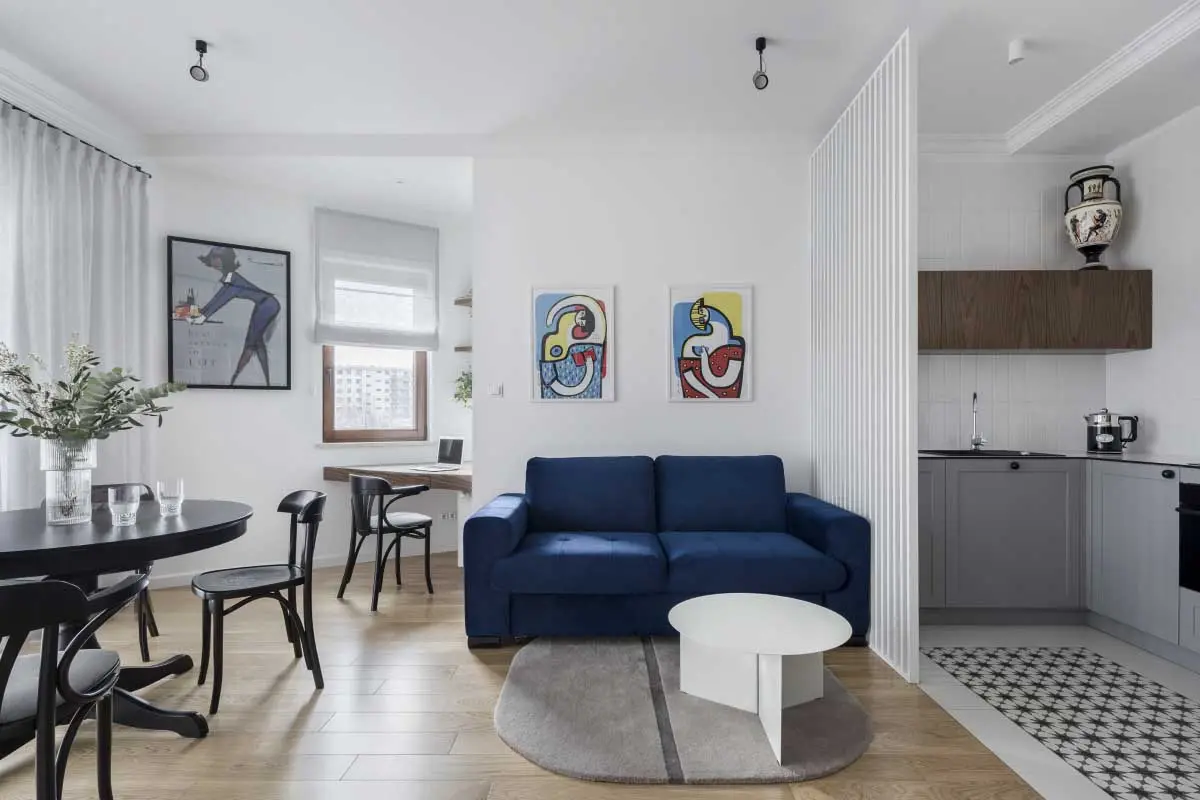 Inspiracją do stworzenia aranżacji wnętrza był minimalizm i funkcjonalność stylu skandynawskiego. Jednak architekci z 3XEL, postanowili nadać całości kobiecy i przytulny charakter. Stąd też błękit jako przewodni motyw kolorystyczny oraz dodatki vintage. Skłonienie się ku eklektyzmowi widoczne jest za sprawą przysufitowych listw sztukateryjnych, wprowadzających element dekoracyjny. Ciekawym przełamaniem monochromatycznej kolorystyki są wzorzyste płytki, pokrywające podłogę aneksu kuchennego oraz łazienki. Industrialnym akcentem są przeszklone drzwi sypialni w metalowej ramie oraz projektory na szynie. Bardzo ciekawy motyw, przyciągający wzrok, stanowią oryginalne grafiki w salonie oraz sypialni. Dzięki zmianom budowlanym architekci stworzyli funkcjonalne wnętrze, a minimalistyczna aranżacja nie jest pozbawiona przytulności. Zostaje tylko żyć tutaj długo i szczęśliwie.