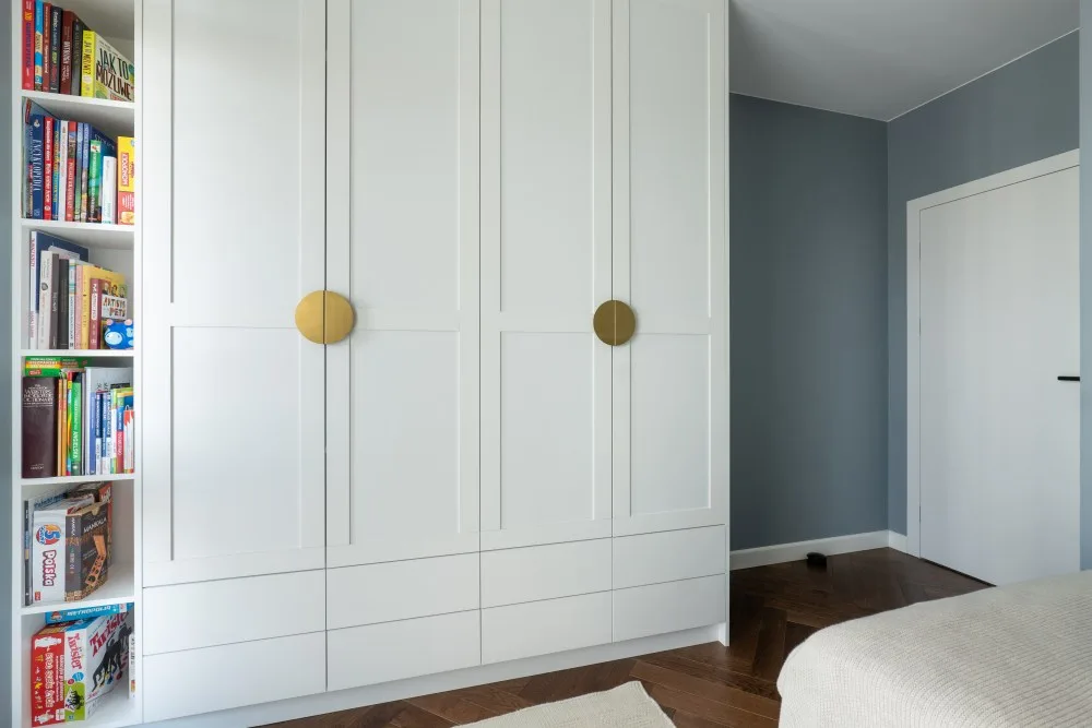 Wszystkie zabudowy stolarskie zostały wykonane z trwałych i estetycznych płyt laminowanych, które zapewniają zarówno wytrzymałość, jak i nowoczesny wygląd. Te rozwiązania są idealnym przykładem, jak funkcjonalność może iść w parze z designem.