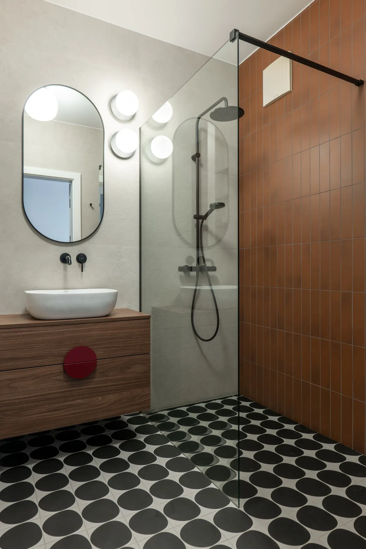 W łazienkach architekci postawili na interesujące detale, które wyróżniają te przestrzenie. Wyważone połączenia kolorów, tekstur i materiałów sprawiają, że każda łazienka to małe dzieło sztuki użytkowej. Detale, takie jak subtelne wzory i nietuzinkowe wykończenia, podkreślają dbałość o każdy element aranżacji.