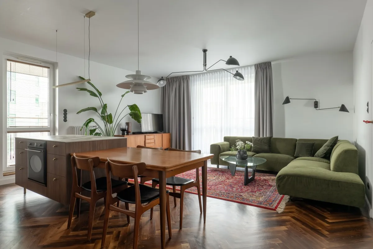 W salonie główną rolę odgrywa zielony welurowy narożnik, który wprowadza nutę luksusu i przytulności. Na tle neutralnej kolorystyki ścian doskonale wyróżnia się także dywan w stylu vintage, który dodaje wnętrzu charakteru i ciepła. Podłoga ułożona w klasyczną jodełkę to ukłon w stronę tradycyjnych rozwiązań, które świetnie współgrają z minimalistycznym wyposażeniem wnętrza.