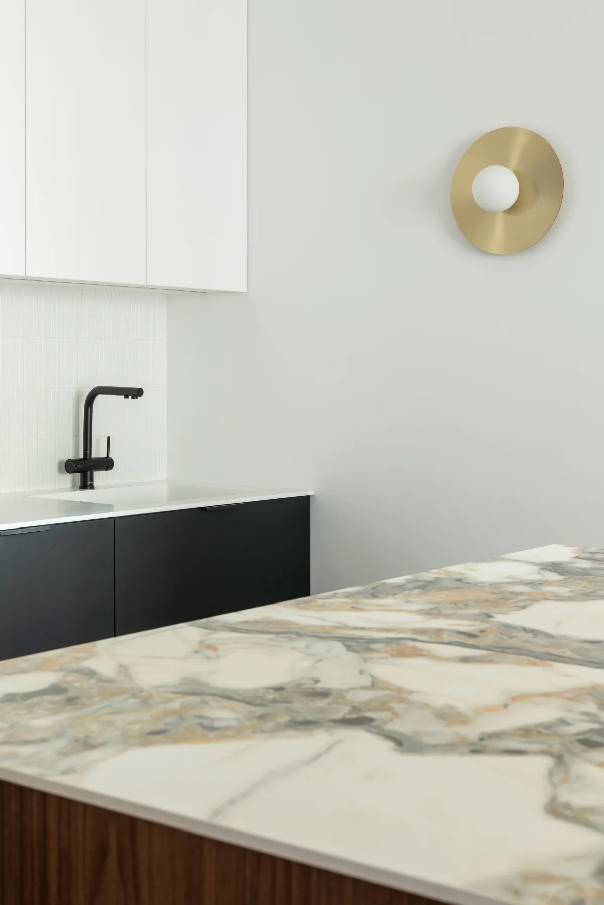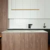 Kuchnia w projekcie Qbik Design to przykład minimalistycznej elegancji. Centralnym punktem jest wyspa kuchenna o lekkiej konstrukcji, wsparta na drewnianych nóżkach, co nadaje jej unikalnego charakteru. Na ścianach znalazły się białe płytki typu kit-kat, które swoją subtelną fakturą i połyskiem ożywiają przestrzeń, jednocześnie pozostając w harmonii z całością. Kuchnia, choć nowoczesna, zachowuje ciepły, domowy charakter.