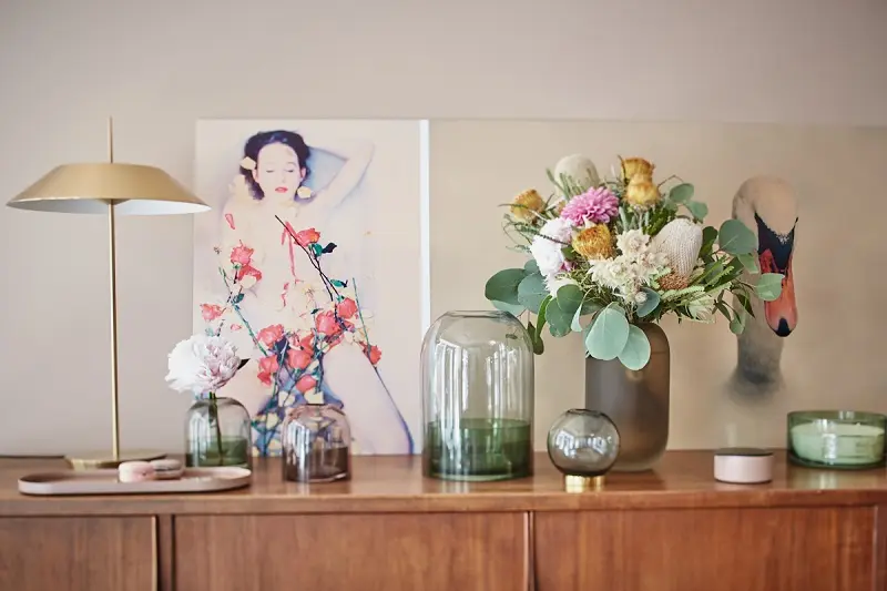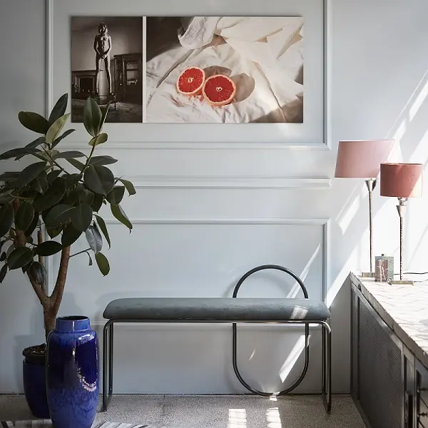 W Pracowni Anny Koszeli-Krawczyk nie mogło zabraknąć sztuki. Wnętrze zdobi kolekcja fotografii autorstwa Poli Esther, cenionej artystki, która na co dzień tworzy w Nowym Jorku. Niepokorne, pełne koloru ujęcia modelek w prowokujących pozach, dodają charakteru i przykuwają spojrzenia. To jednak nie jedyne dzieła sztuki – jedną ze ścian zdobi kolaż Aleksandry Morawiak – subtelny, kobiecy i utrzymany w pastelowych kolorach.