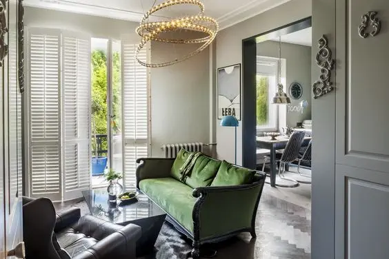 Bardzo klimatyczne wnętrze w starej kamienicy na Mokotowie. Apartament z mieszanką dwóch wyjątkowych stylów, odnajdziemy odrobinę loftowych klimatów jak również vintage. O oryginalności i wyjątkowości wnętrza świadczą drobiazgi, dodatki, detale jak również wszechobecna sztuka. Zieleń wprowadza spokój do wnętrza jak również nadaje elegancji, wytworności. Sztukateria na ścianie ożywia ją, ściana przestaje być płaska, nadaje fakturę, osiągamy efekt głębi.