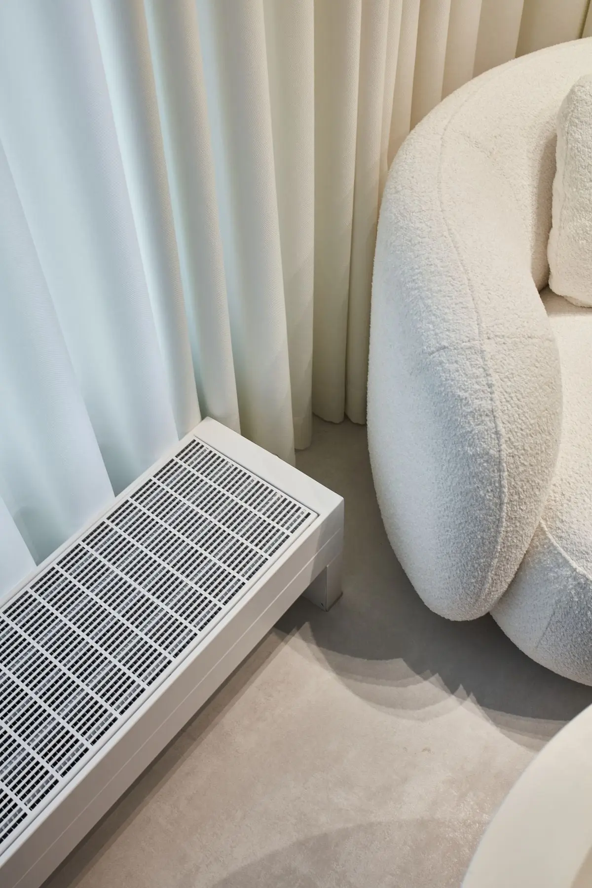 J.K.: Metraż i wysokość rzutowały przede wszystkim na zaplanowanie rozmieszczenia i liczby grzejników, dlatego zdecydowaliśmy się na zrobienie tzw. projektu grzewczego przez profesjonalistów z firmy Vasco. Marzyłam o płaskich grzejnikach, których prawie nie widać, jednak specjalista zdecydowanie mi to odradził. Okazało się, że moje uwielbienie do minimalizmu nijak się ma do ogrzania przestrzeni. Jako konsumenci bardzo często patrzymy tylko i wyłącznie na estetykę, a zapominamy o funkcjonalności – to duży błąd. Gdyby nie ekspert od systemu ogrzewania, prawdopodobnie w ostatniej chwili zmieniałabym kaloryfery, bo nie podobało mi się, że wystają. Na szczęście design produktów Vasco jest na takim poziomie, że grzejniki są jednocześnie funkcjonalne, dekoracyjne i użytkowe, np. jedna z moich córek używa kaloryfera jako półki na zabawki, niebawem (poza okresem grzewczym) zrobię tam siedzisko i nie będzie to stanowiło problemu. W innym pokoju mamy model PRIMULA w kształcie ławki, który dodaje klimatu aranżacji. Zakochałam się także w pionowym modelu MONO BRYCE z dekoracyjnymi żłobieniami – mamy zainstalowane trzy obok siebie, wyglądają jak nowoczesna rzeźba.