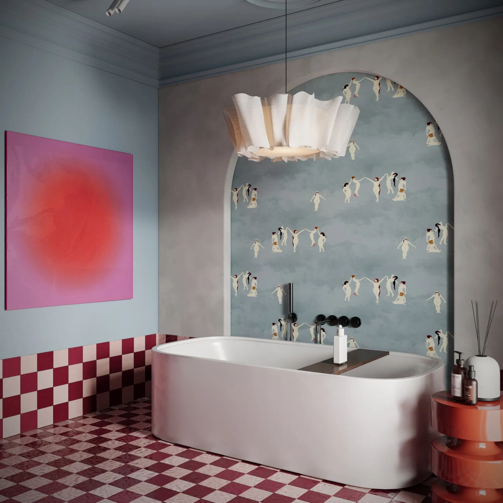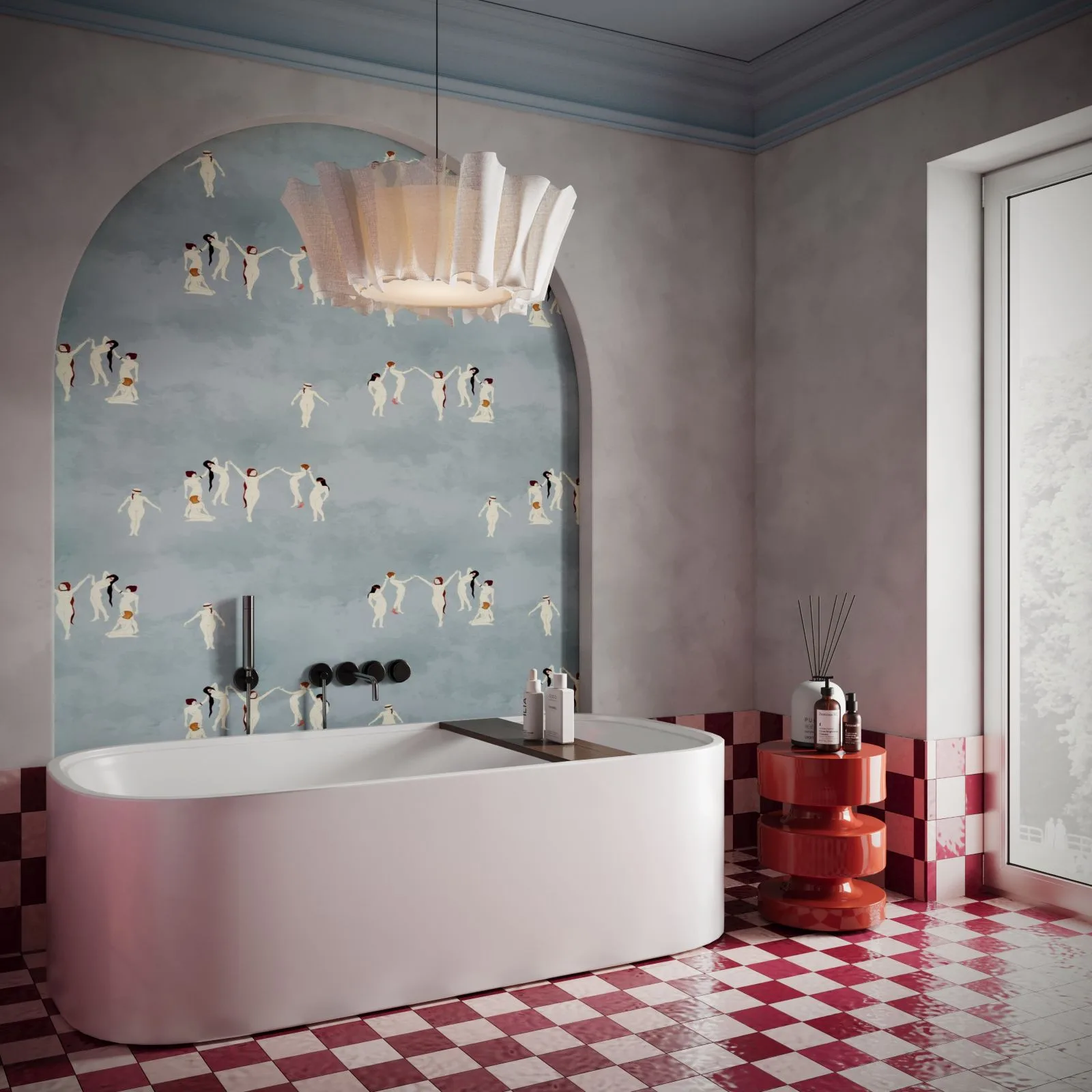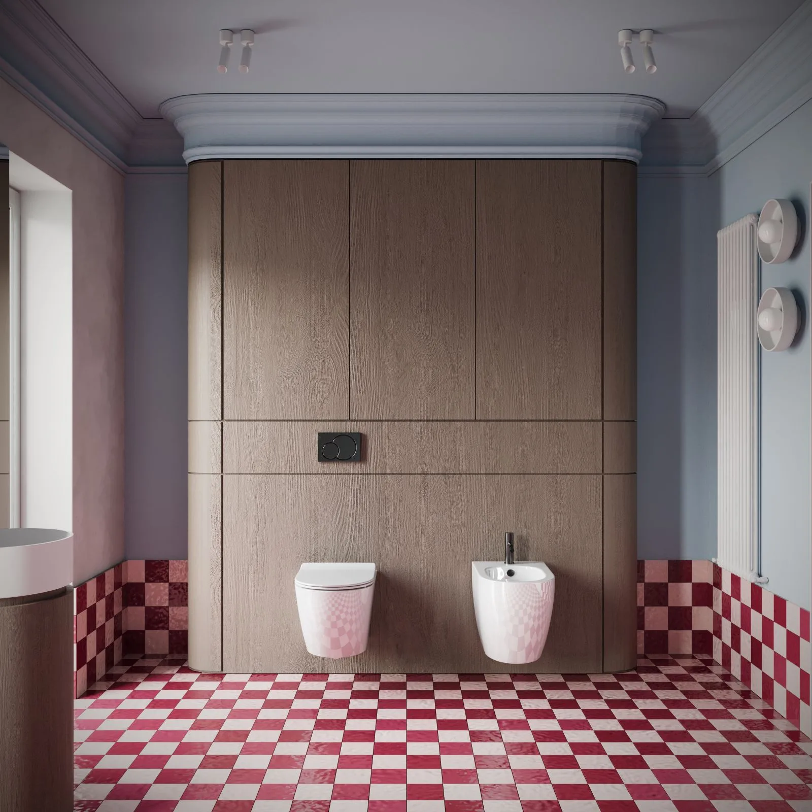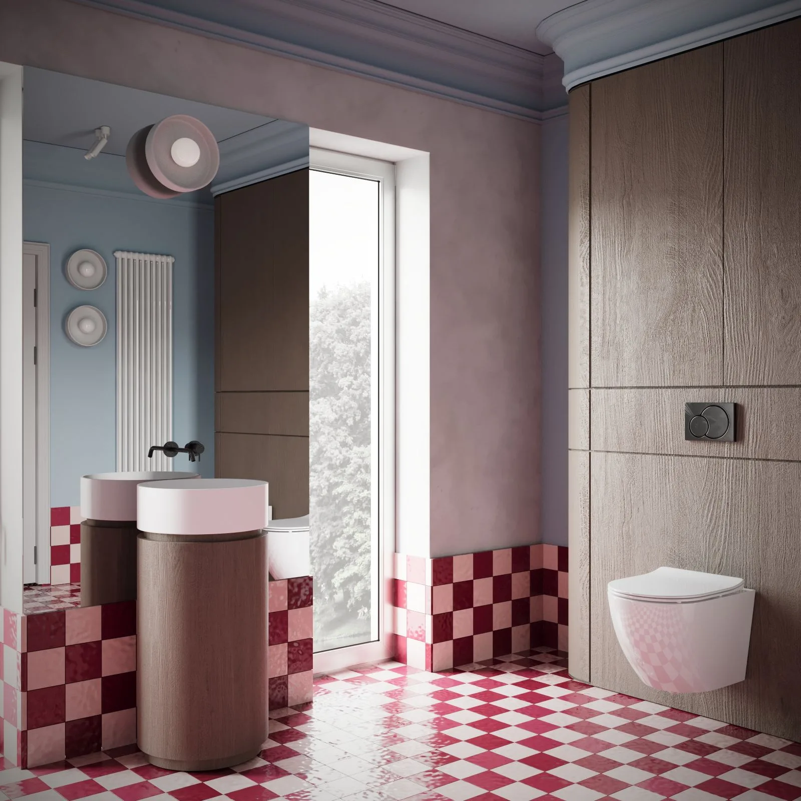 Serce aranżacji stanowi posadzka w klasyczny, lecz odświeżony na nowo motyw – różowo-czerwoną szachownicę. To nie tylko dekoracyjna baza, ale również mocny akcent, który definiuje charakter całego wnętrza. Geometria nadaje rytm przestrzeni, a intensywne barwy przełamują delikatne, pastelowe ściany, wprowadzając do wnętrza dynamikę i subtelną odwagę.