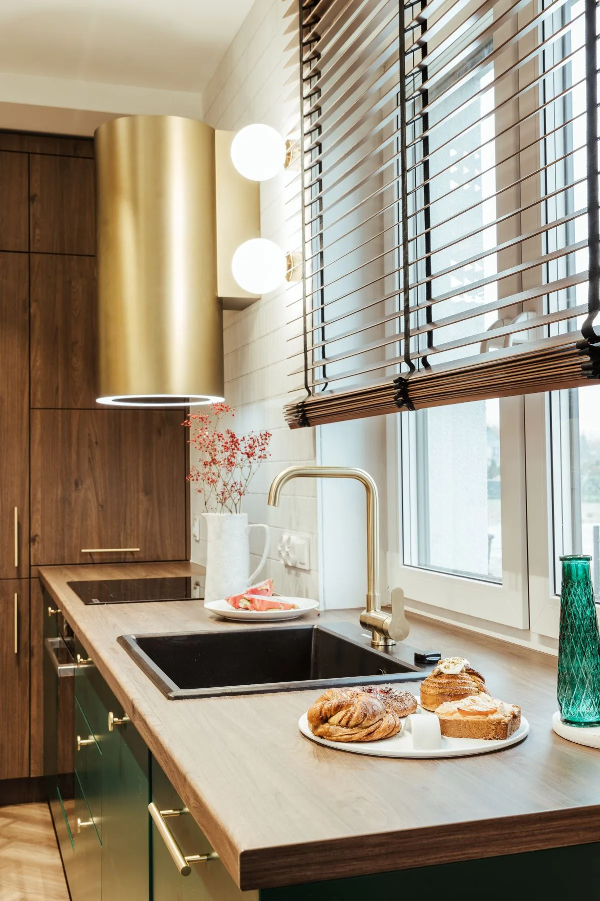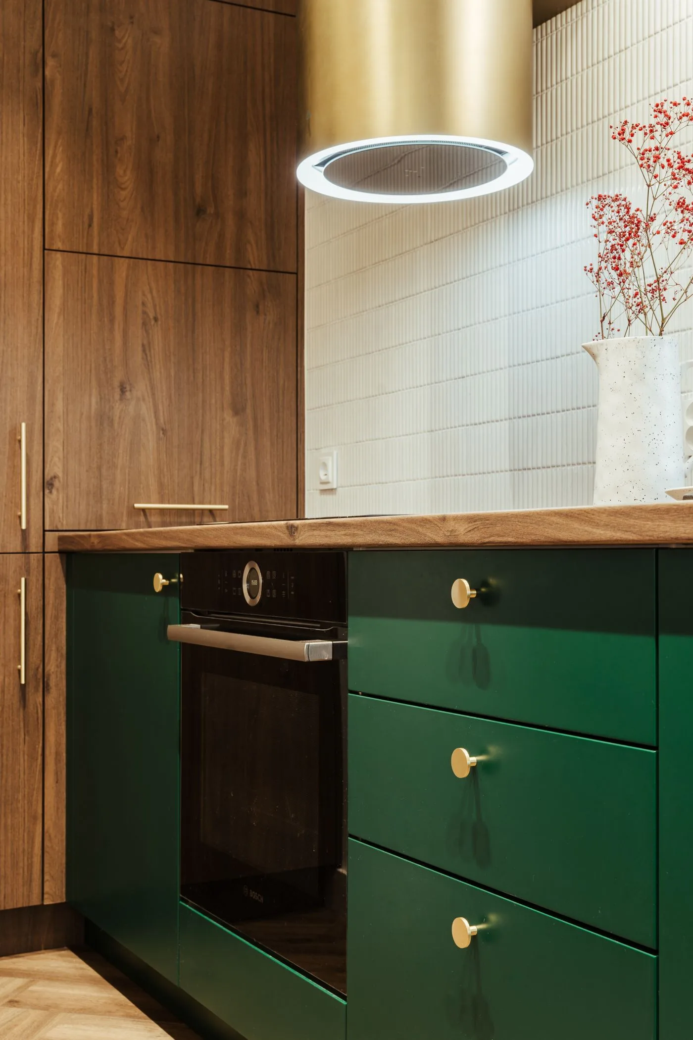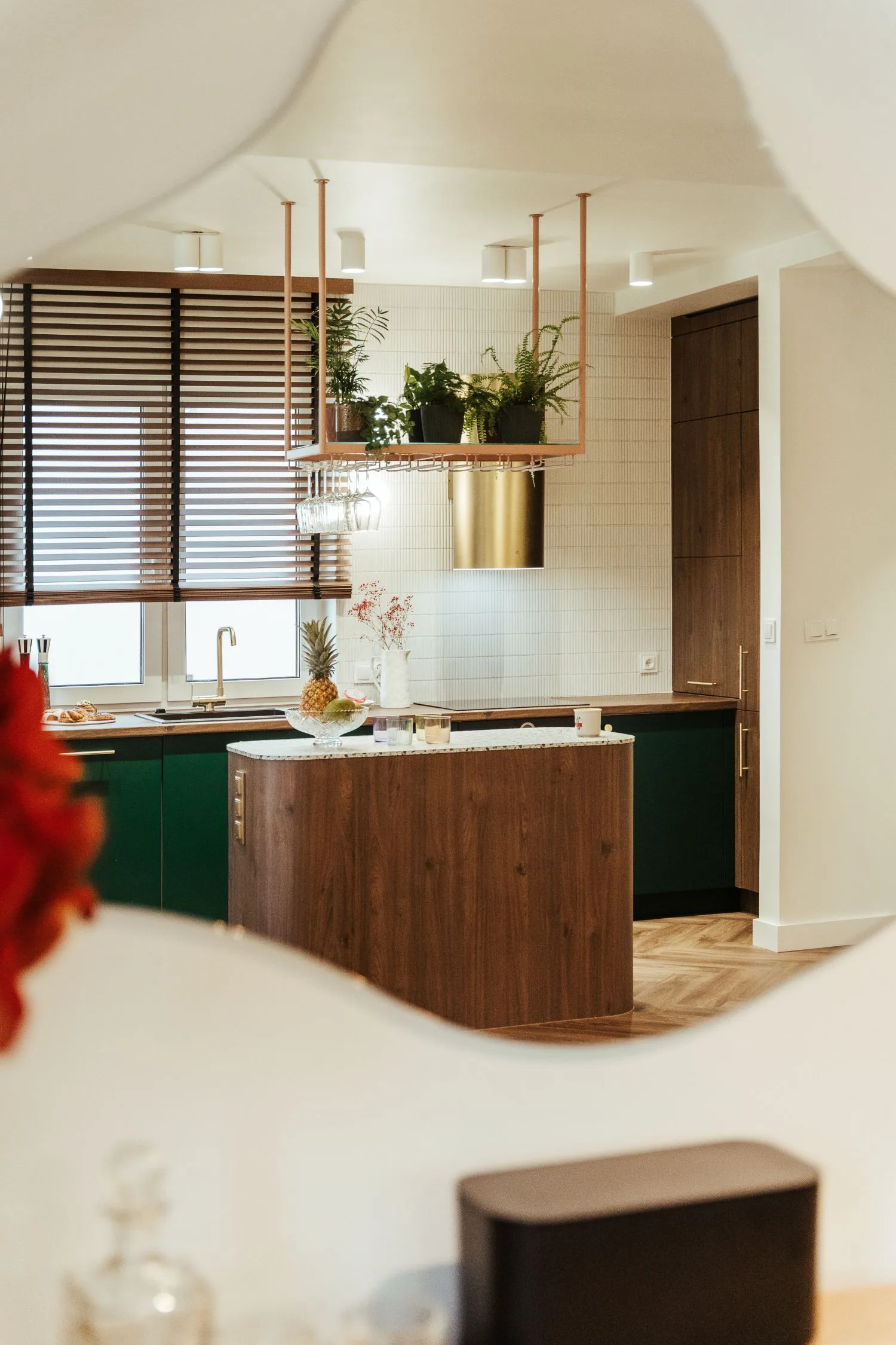 W części dziennej kolor robi robotę, ale nie działa solo. Butelkowozielona zabudowa kuchni ze złotymi uchwytami tworzy bazę pełną głębi, którą ociepla orzechowy blat. W centrum pojawia się wyspa o zaoblonej formie – miękka linia przełamuje geometryczność zabudowy i wprowadza retro sznyt. Kropką nad i jest cienki blat imitujący kolorowe terazzo, który dodaje lekkości i artystycznego charakteru.