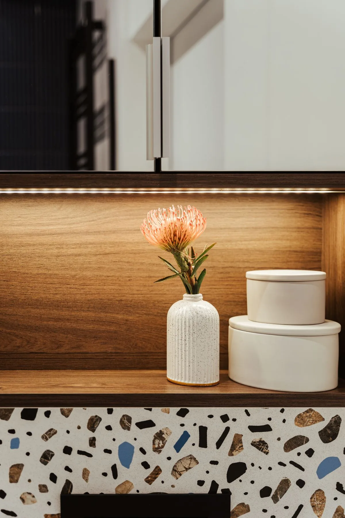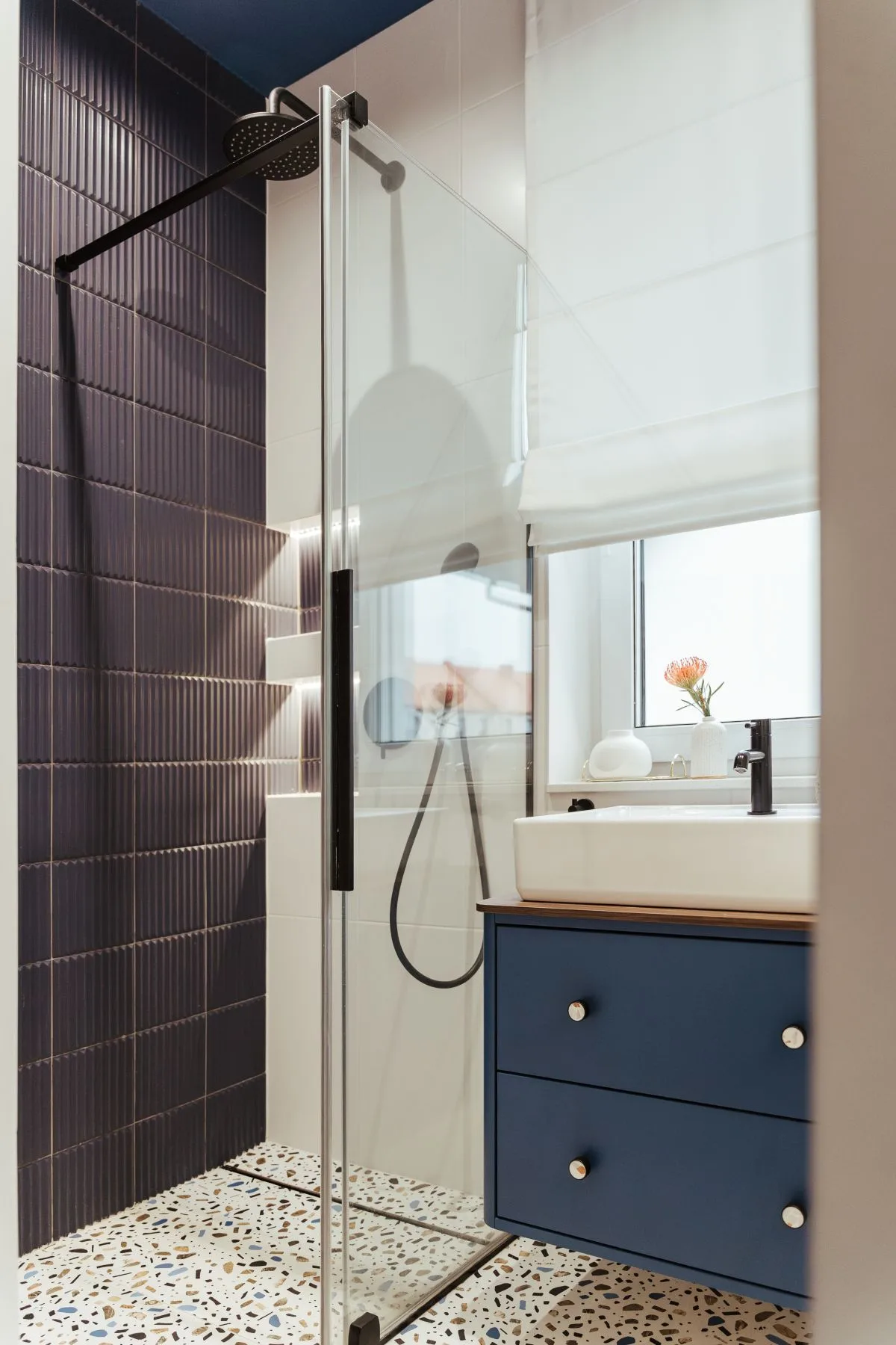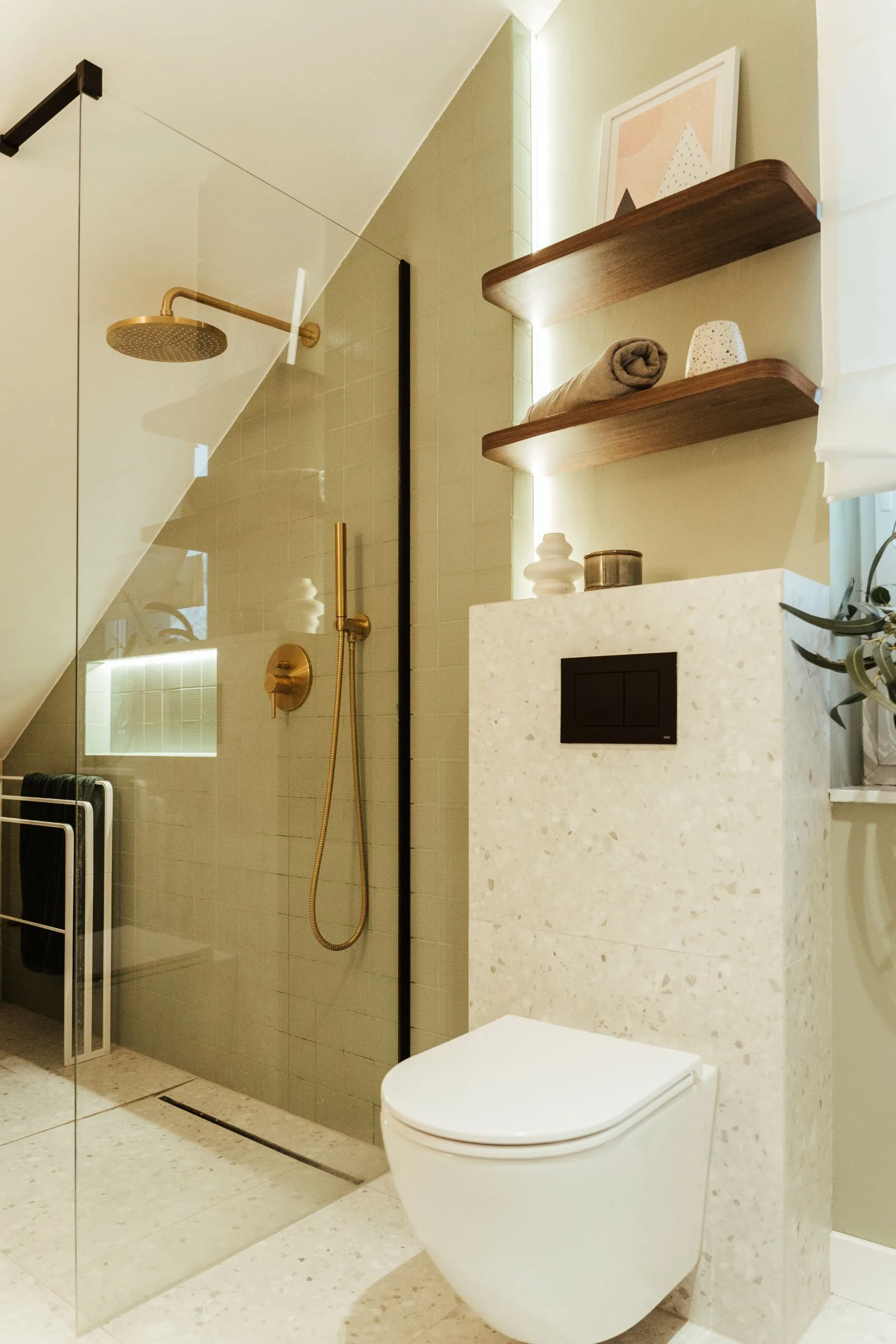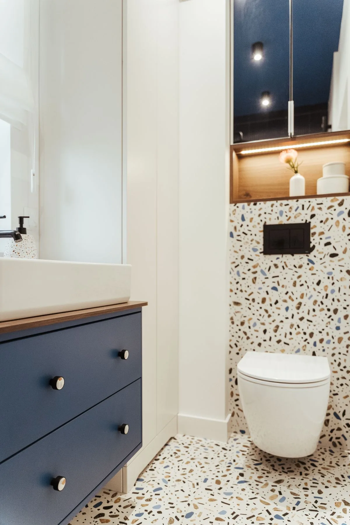W części dziennej kolor robi robotę, ale nie działa solo. Butelkowozielona zabudowa kuchni ze złotymi uchwytami tworzy bazę pełną głębi, którą ociepla orzechowy blat. W centrum pojawia się wyspa o zaoblonej formie – miękka linia przełamuje geometryczność zabudowy i wprowadza retro sznyt. Kropką nad i jest cienki blat imitujący kolorowe terazzo, który dodaje lekkości i artystycznego charakteru.