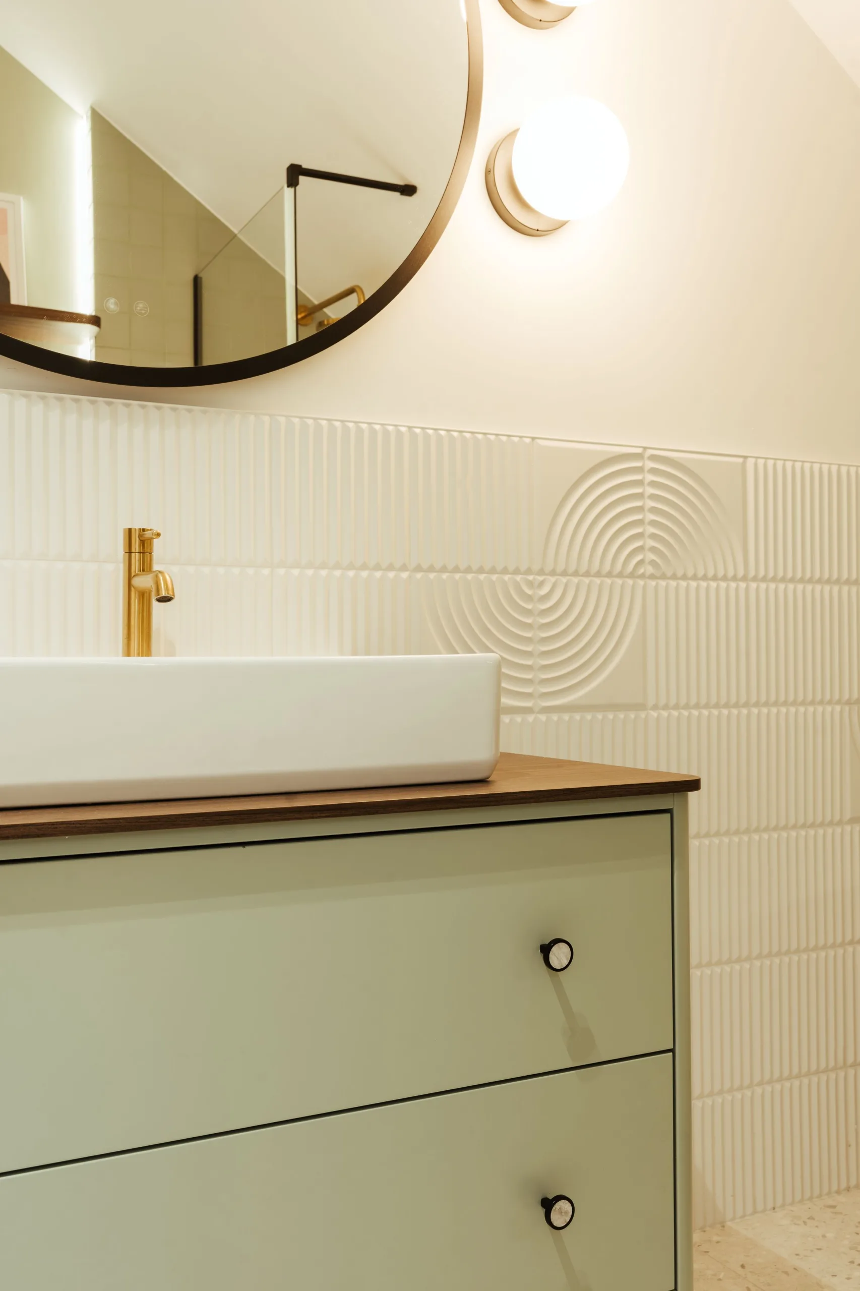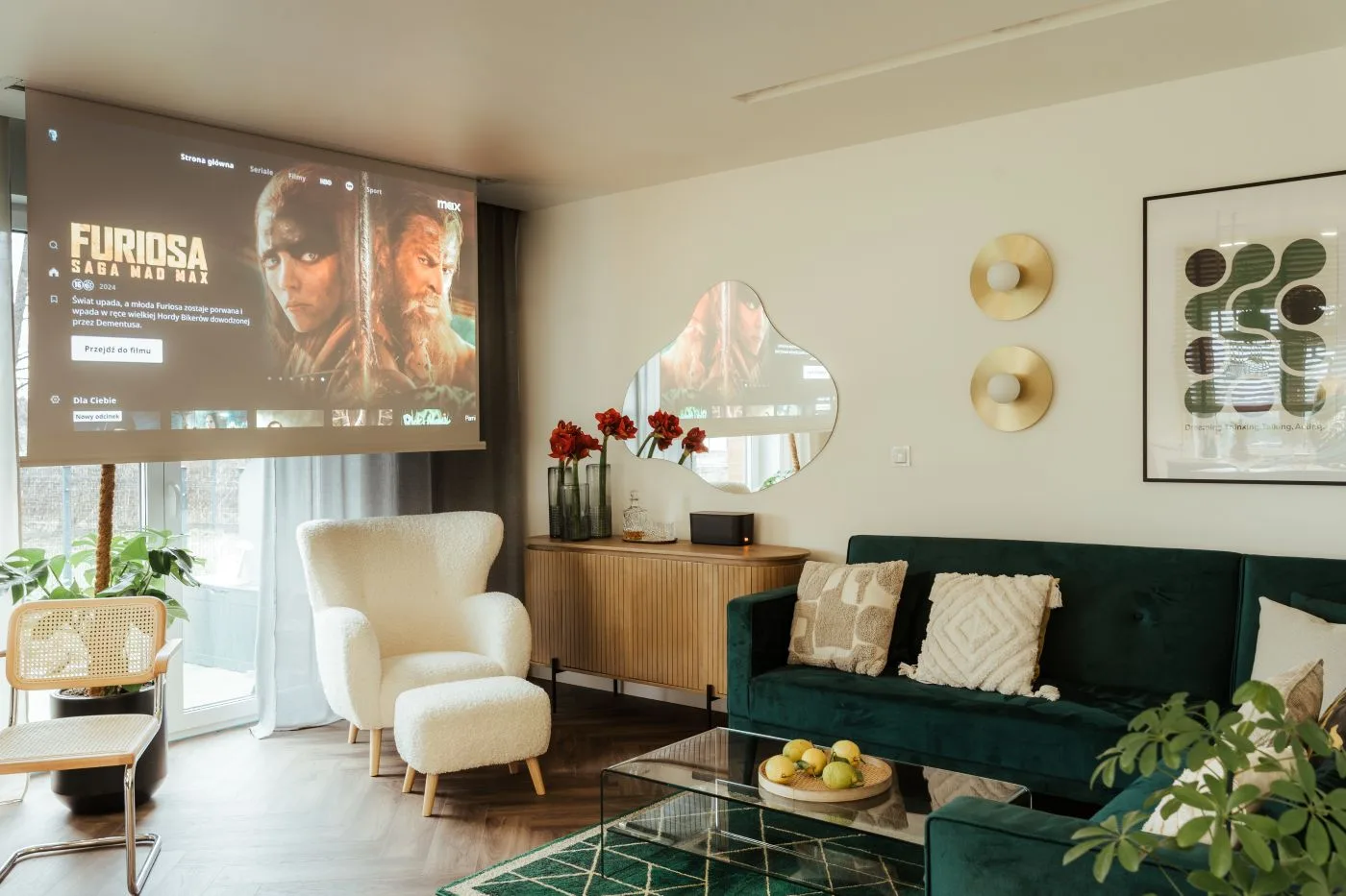 Salon trzyma klimat: wygodny narożnik w kolorze butelkowej zieleni i jasny fotel bouclé tworzą duet miękki, przytulny, a jednocześnie nowoczesny. Ekran i rzutnik pozwalają cieszyć się kinem domowym bez zabierania wnętrzu oddechu. Złote kinkiety i organiczne lustro zamykają całość w estetyce współczesnego vintage – eleganckiej, ale nie „ciężkiej”.