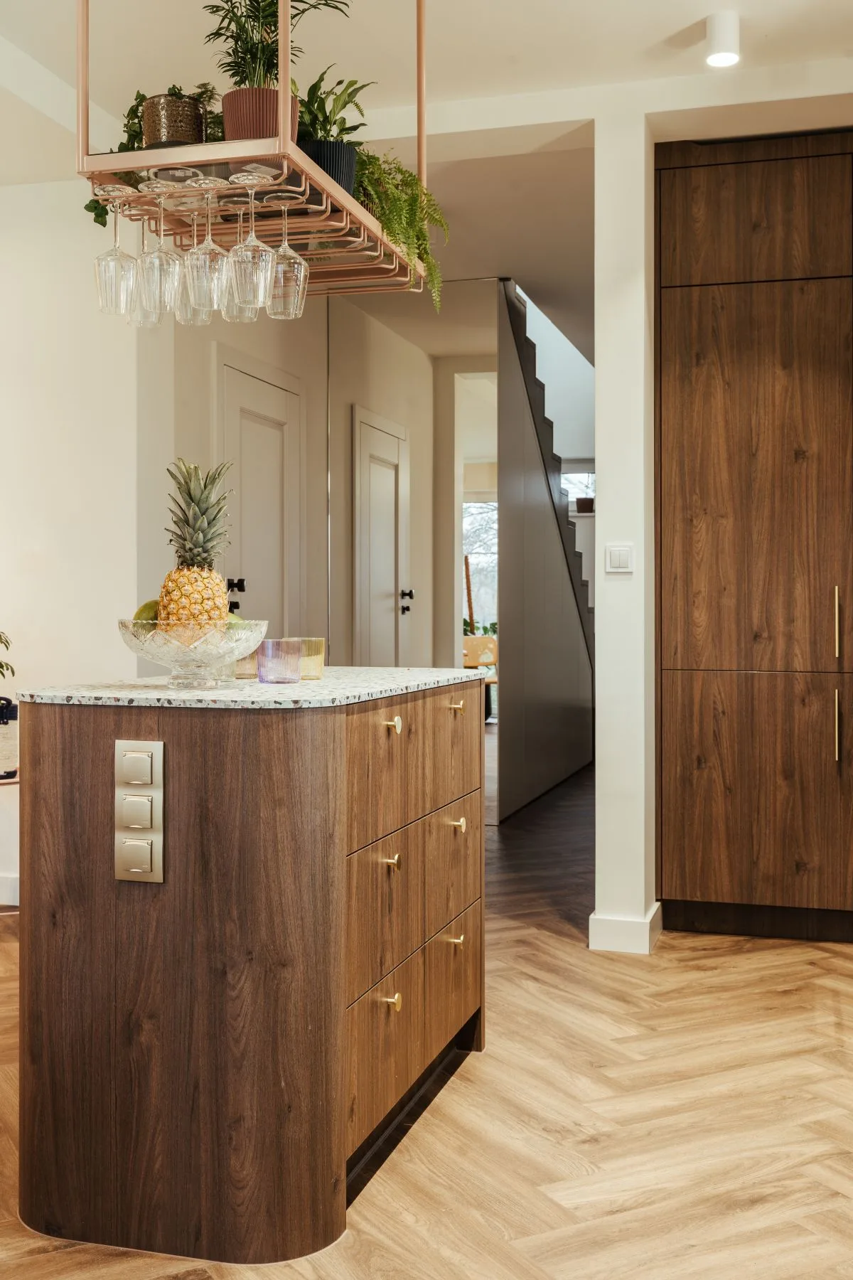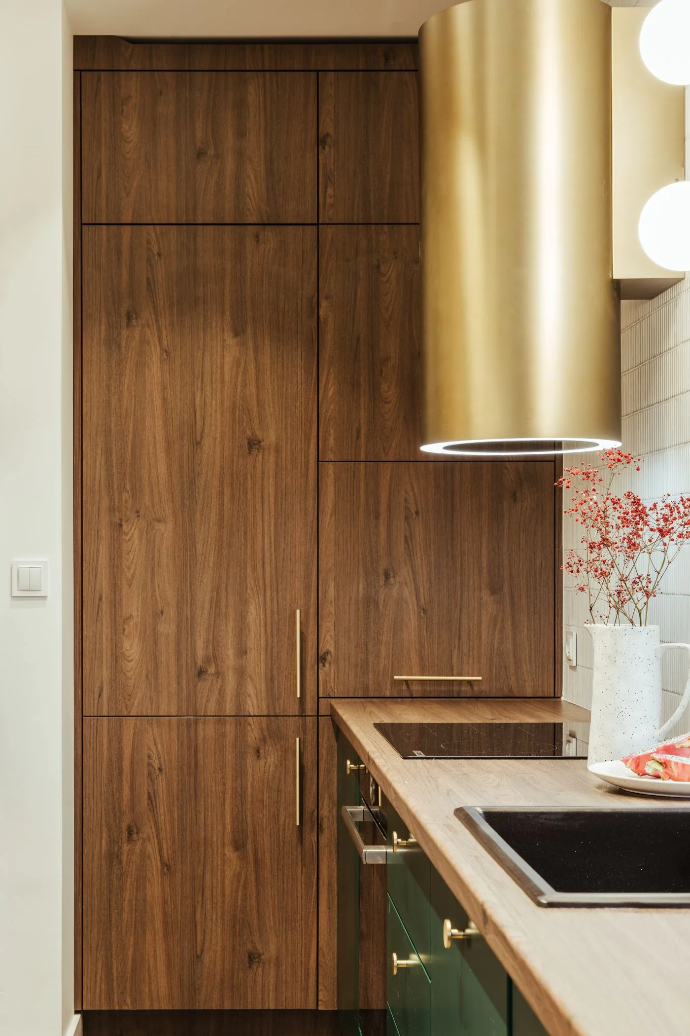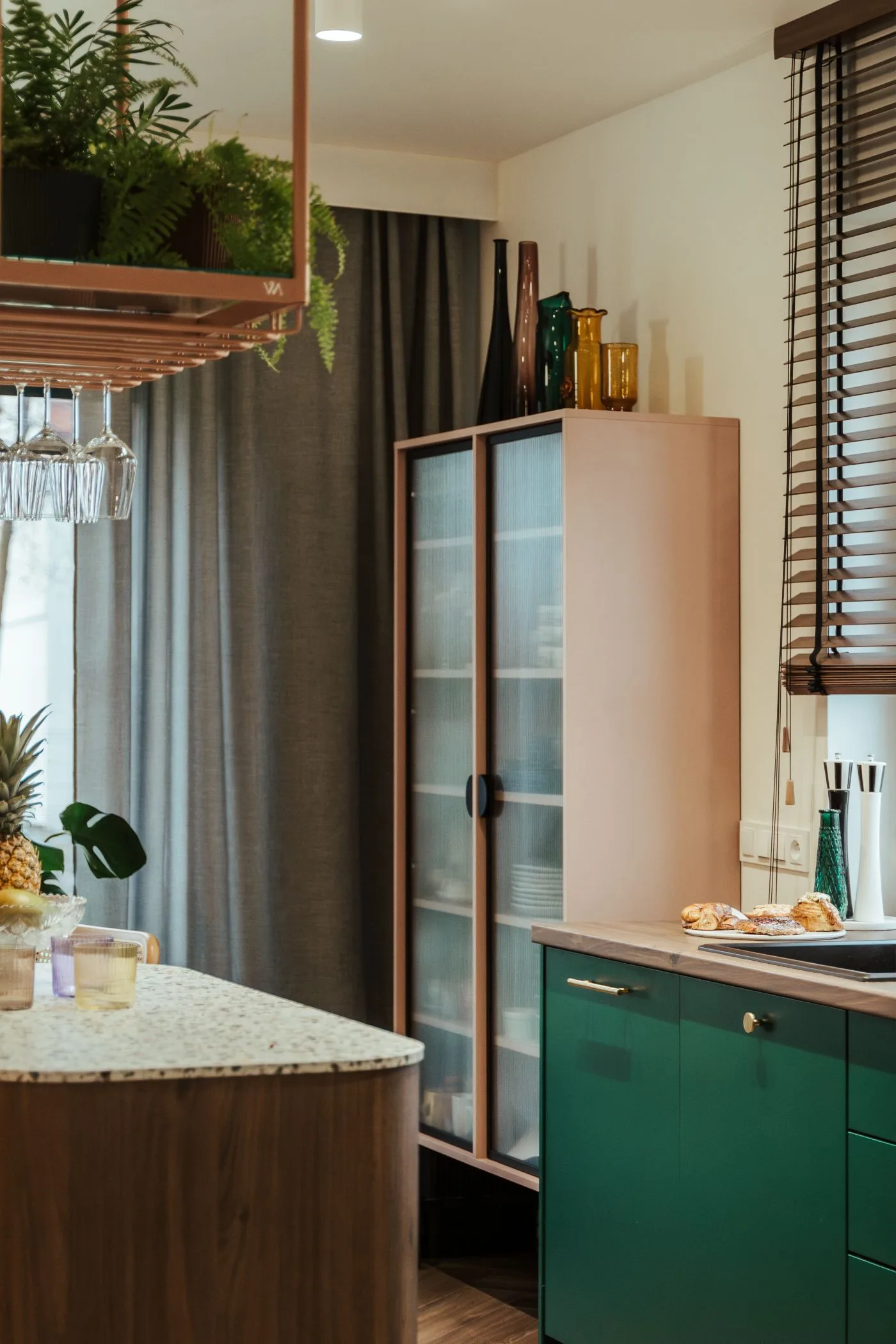 Pudrowy róż pojawia się zaskakująco – w wieszaku na kieliszki i doniczkach nad blatem. Ten akcent działa jak biżuteria: przełamuje ciemniejsze tony zieleni, dodaje świeżości, a przy okazji pięknie dialoguje ze złotem (okap i detale). Zamiast klasycznych górnych szafek zastosowano zabudowę kryjącą ekspres oraz witrynkę z ryflowanym szkłem w odcieniu pudrowego różu – jest lekko, ale z charakterem.