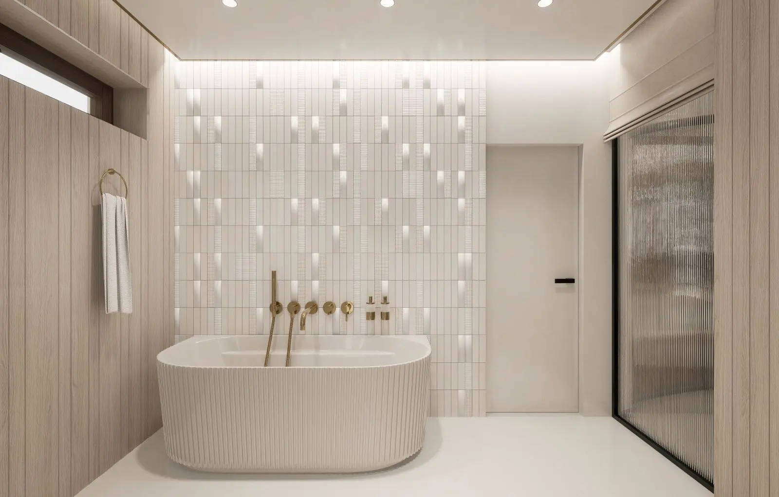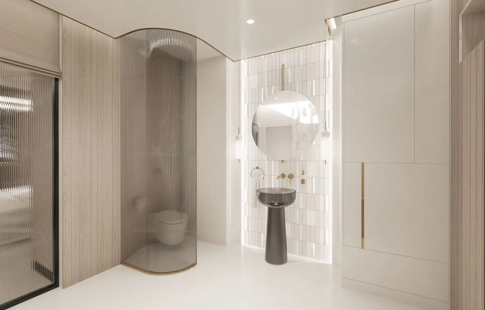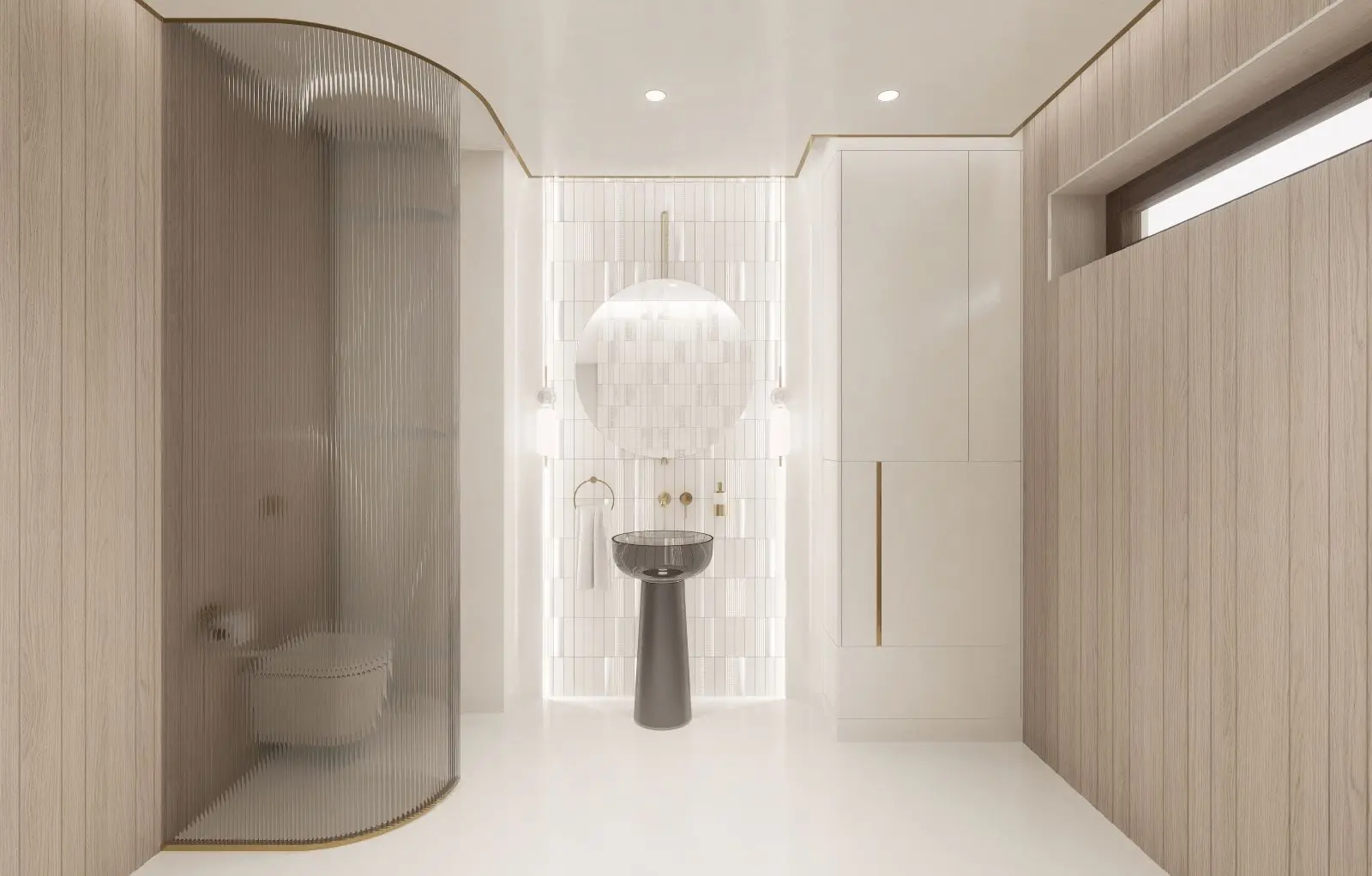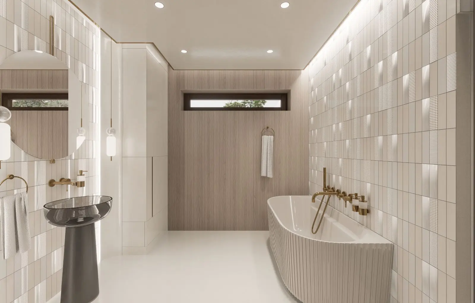 W luksusowym projekcie domu zaprojektowanym przez Novo Architekci, szczególną uwagę zwraca przestronna łazienka, gdzie dominuje harmonia naturalnych tonów i nowoczesnych rozwiązań. Kluczowym elementem tej przestrzeni jest żywiczna umywalka wolnostojąca na nóżce, która stanowi prawdziwy punkt centralny wnętrza.