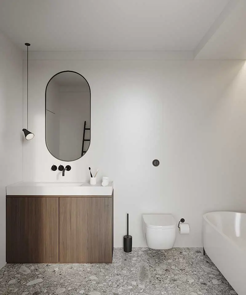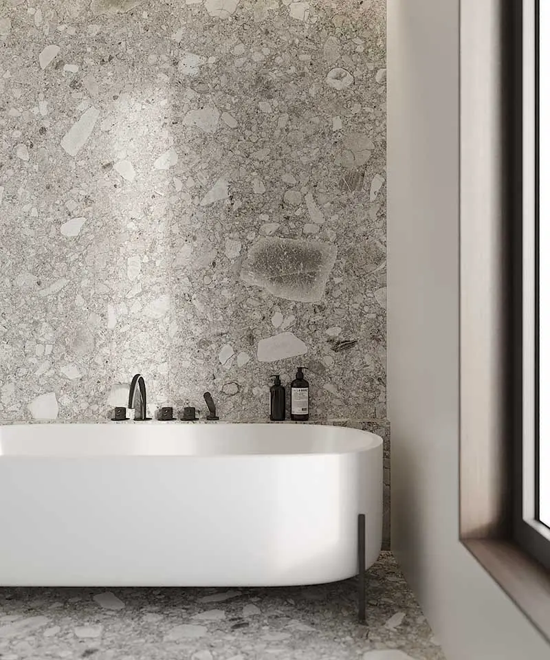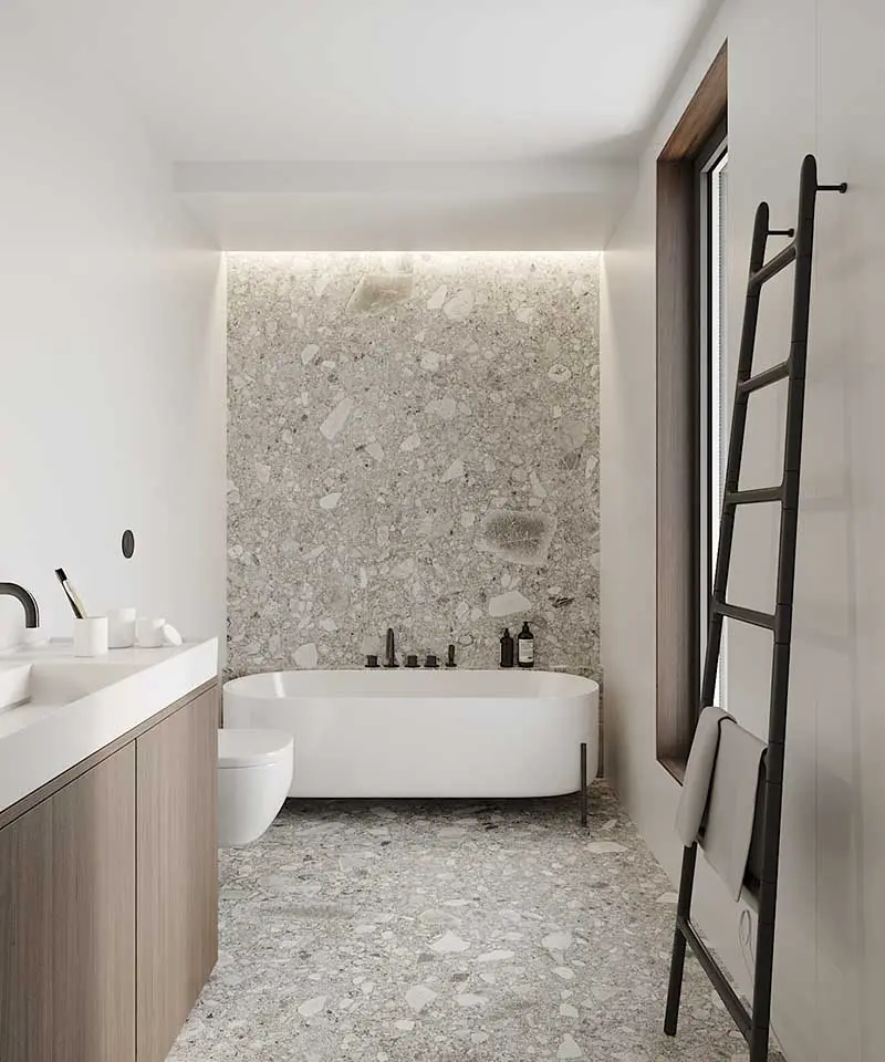 Łazienka jest ascetyczna i monochromatyczna, mimo to zachowuje analogię barw i materiałów z resztą pomieszczeń. Ciekawym zabiegiem aranżacyjnym jest ściana nad wanną z płyt XXL z szarego lastryko.