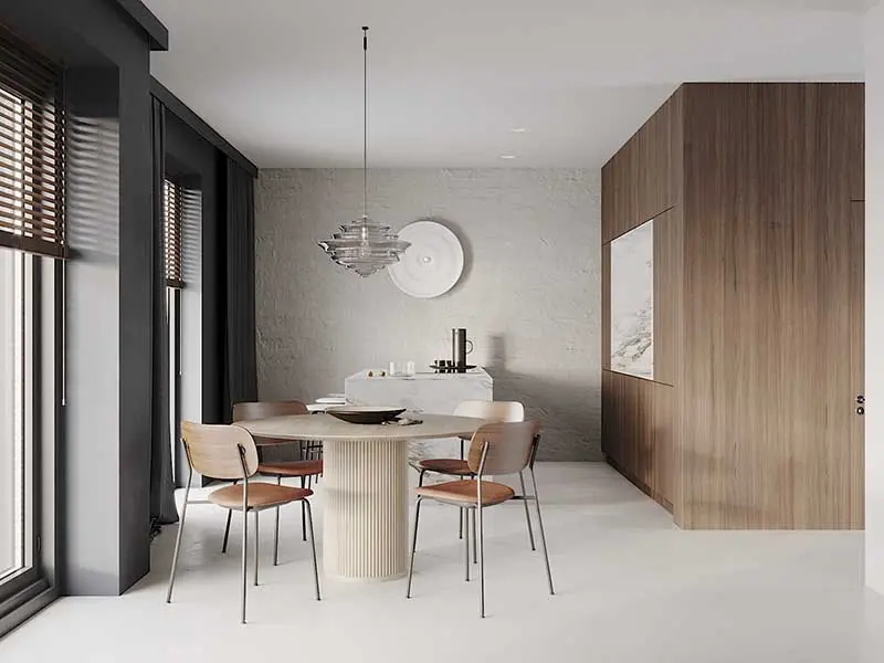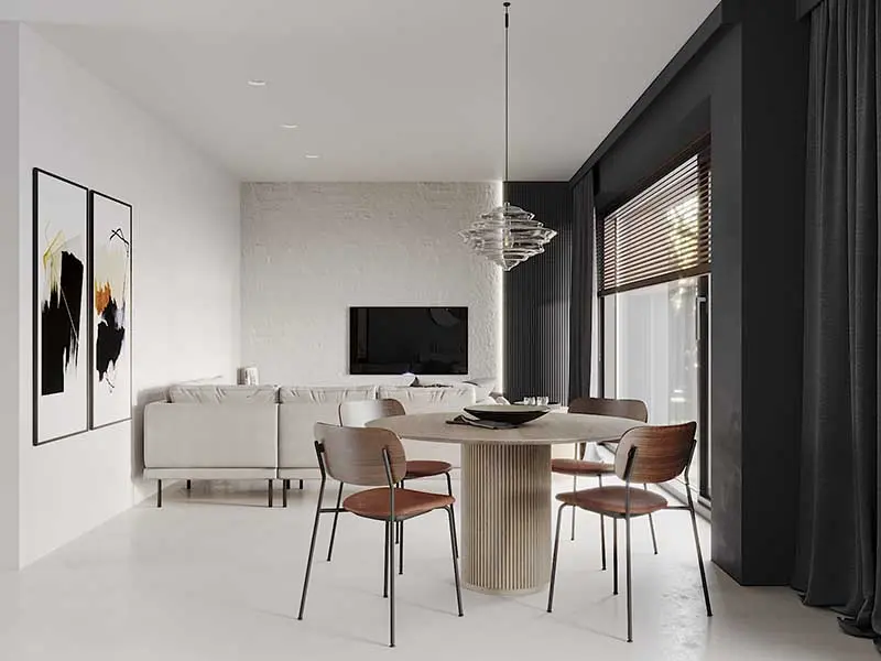 Nad stołem w części jadalnianej, zawieszono bardzo ciekawą w formie szklaną lampę Lasvit Neverending Glory, która znakomicie współgra z okrągłym stołem i klasycznymi krzesłami na metalowych nóżkach.