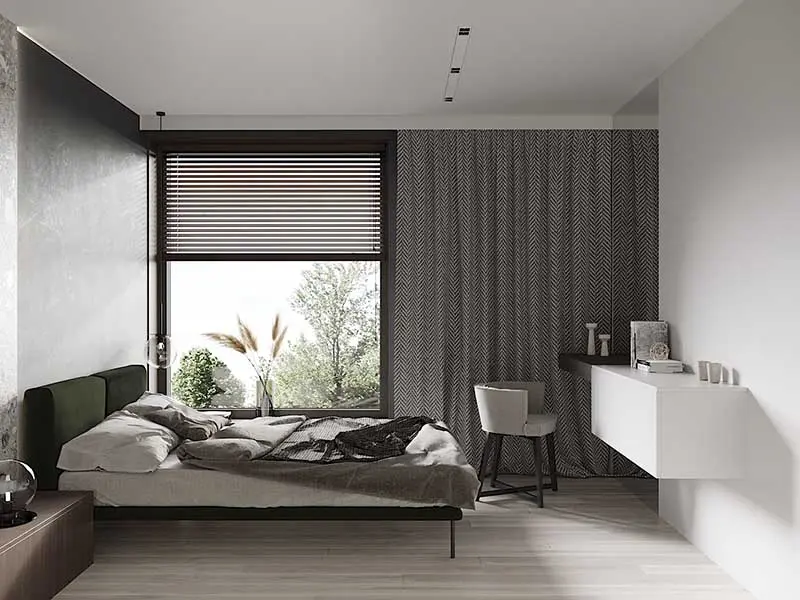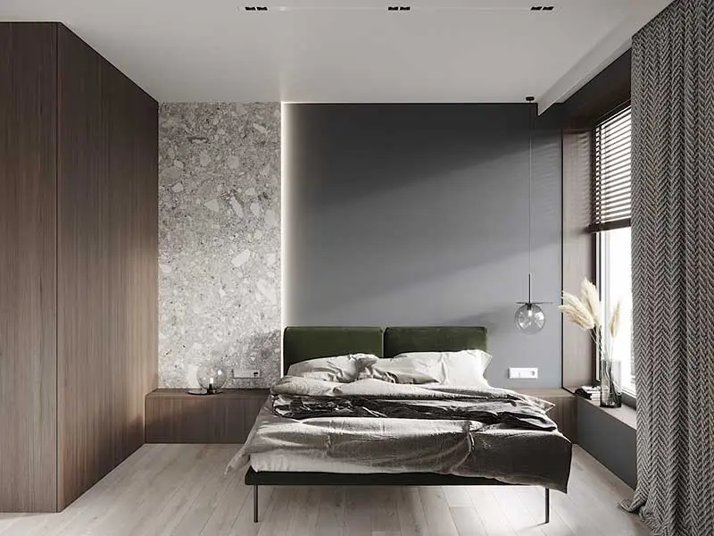 Ten klimat przeniesiony jest do sypialni, jest on jednak zdecydowanie ocieplony różnorodnością tkanin i ich teksturami.