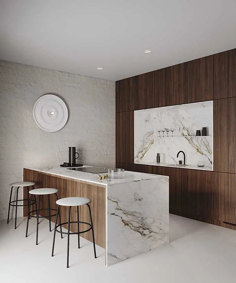 Kuchnia klasyczna lecz minimalistyczna z przepiękną i nowoczesną wyspą z płyt marmurowych połączonych z elementami drewna. Otwarta przestrzeń sprzyja dużej ilości naturalnego światła, powiewu świeżości i podkreśla znakomite wzornictwo oraz szlachetne materiały.