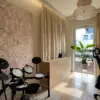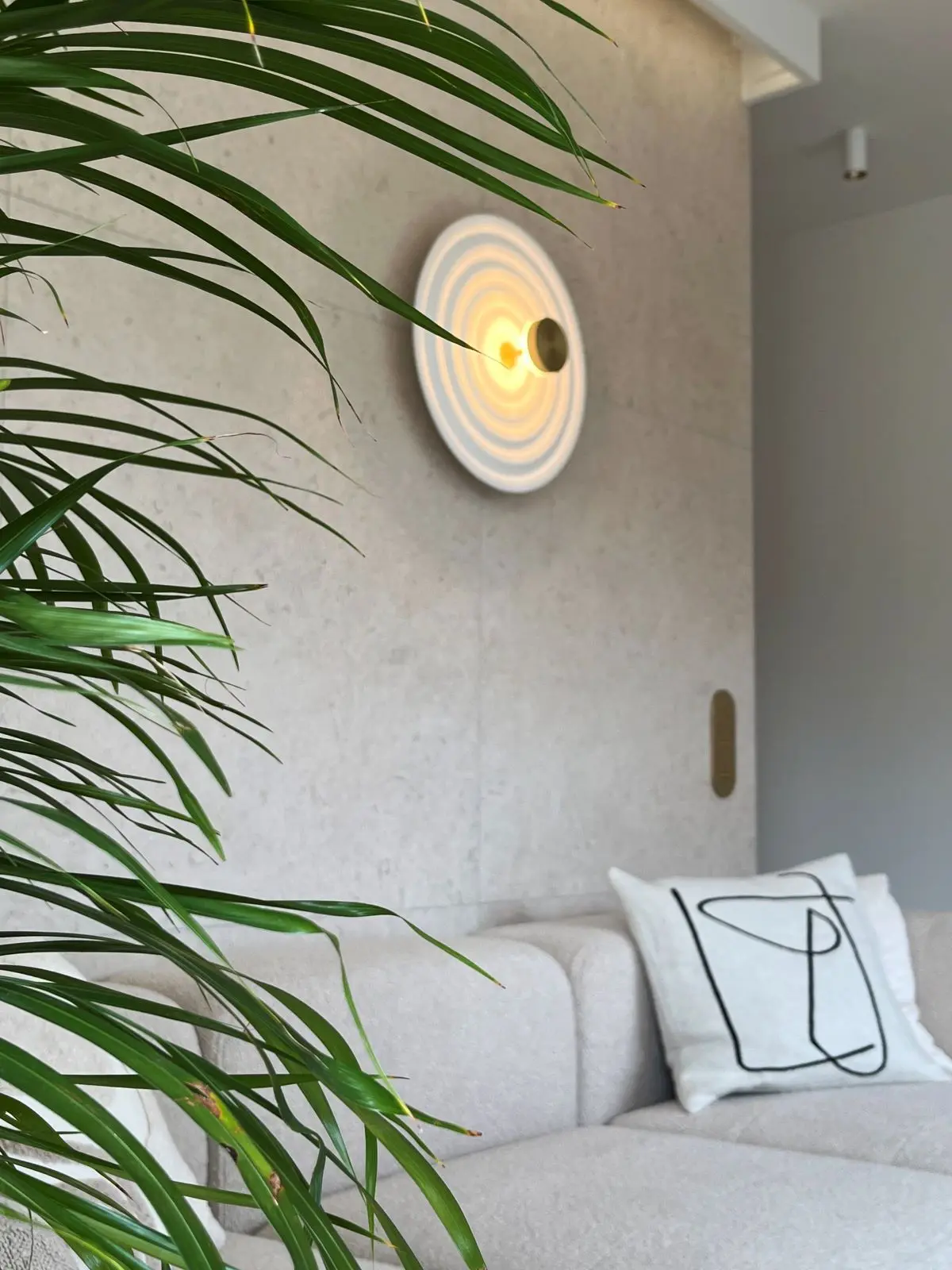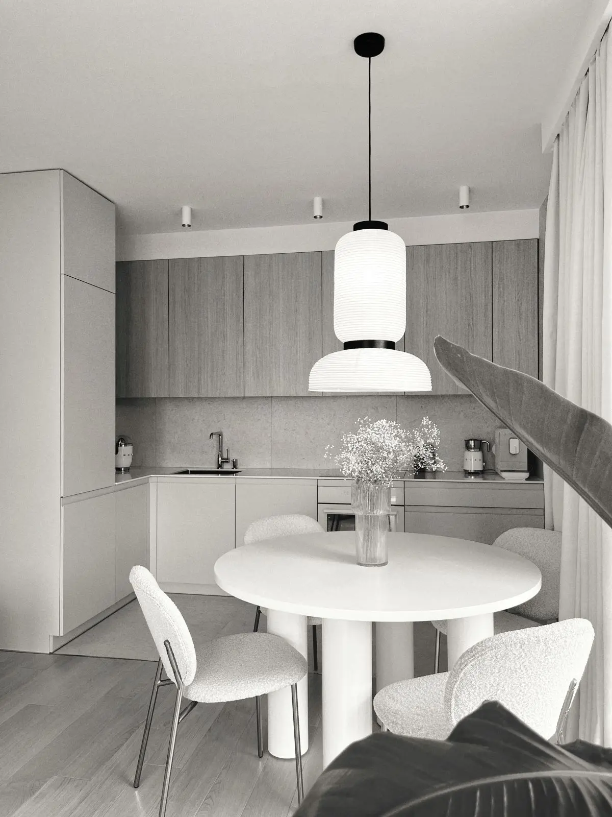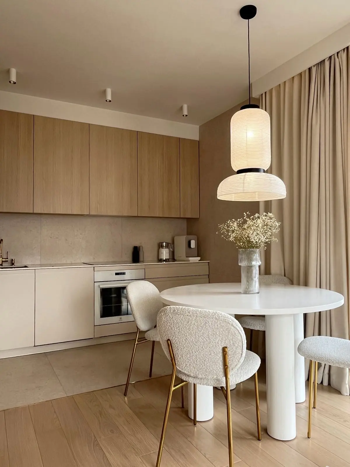 Salon, utrzymany w tonacji beżu, emanuje spokojem i elegancją. Miękkie tkaniny otulające wnętrze wprowadzają do niego przytulność, zachęcając do relaksu i odpoczynku. Centralnym punktem salonu są duże okna, które nie tylko zapewniają mnóstwo naturalnego światła, ale także optycznie powiększają przestrzeń.