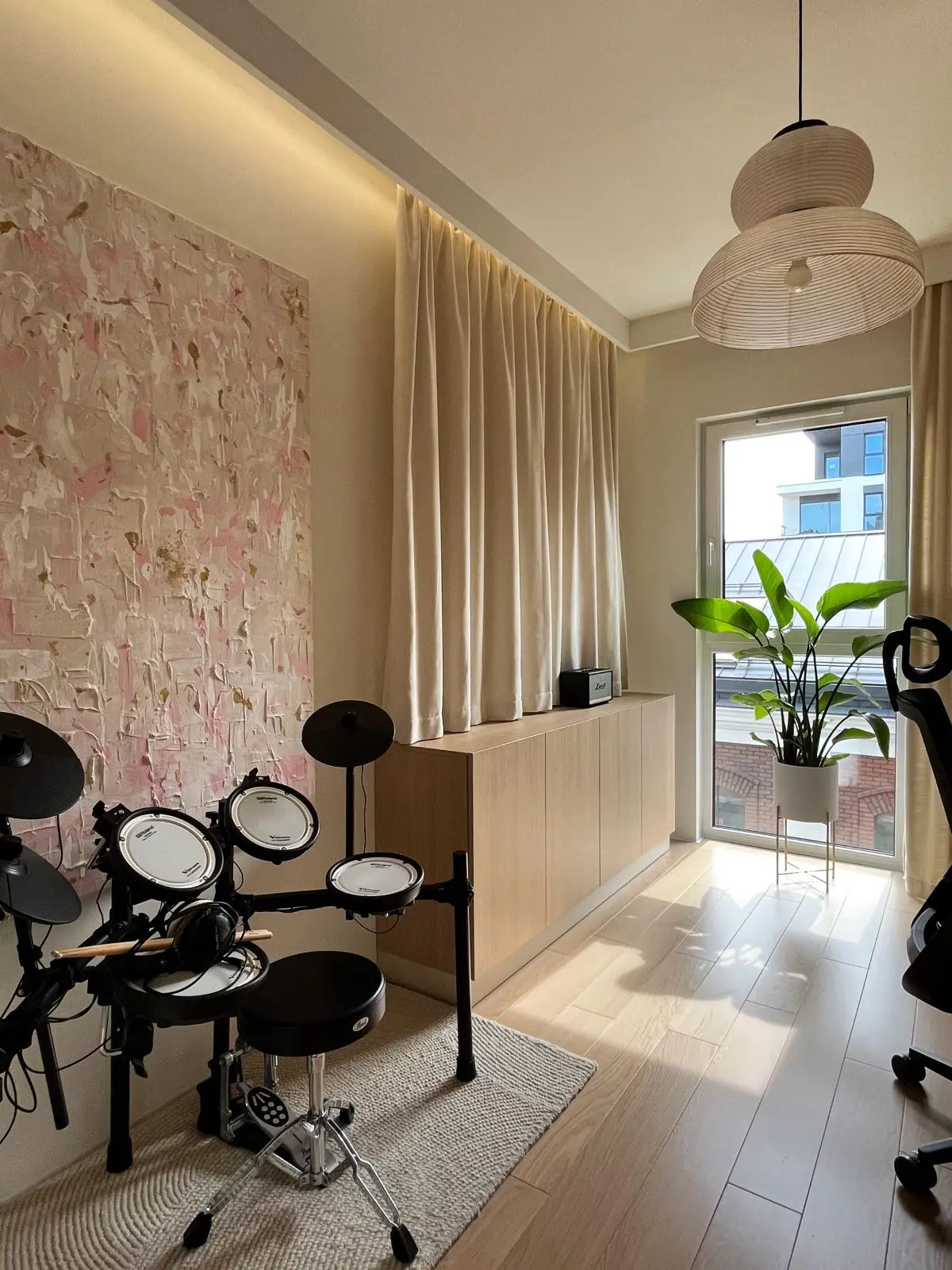Jednym z najciekawszych elementów dekoracyjnych jest różowy fotel, który stanowi wyrazisty akcent kolorystyczny w harmonijnym wnętrzu. Dzięki niemu salon nabiera charakteru i unikalności, stając się miejscem, które przyciąga wzrok i zachwyca.