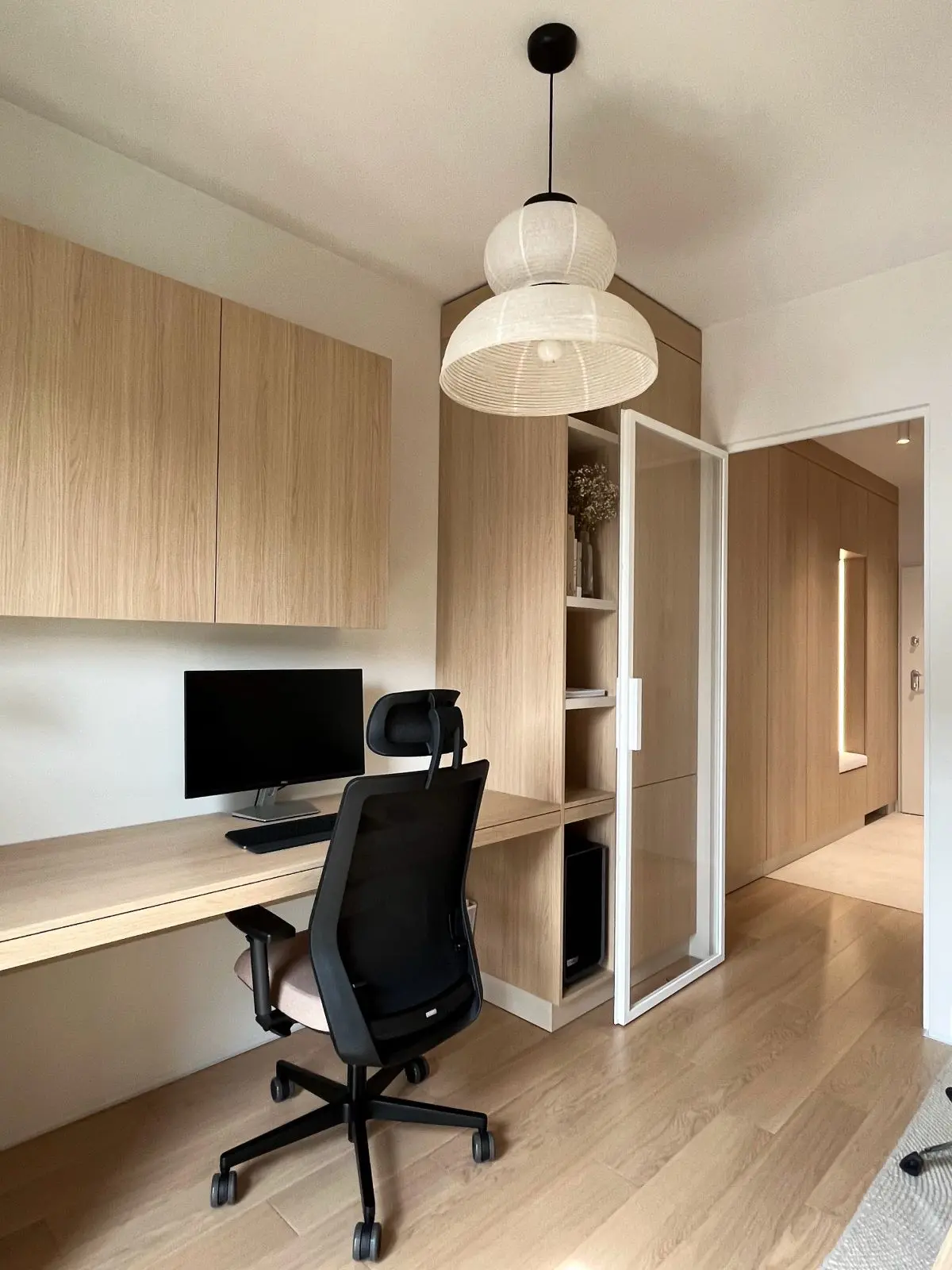 Centralnym punktem kuchni są drewniane górne szafki, które doskonale komponują się z resztą wystroju. Naturalne drewno wprowadza do wnętrza ciepło i przytulność, harmonizując z blatami w podobnym odcieniu. Całość dopełniają szaro-beżowe płytki, które nadają przestrzeni nowoczesnego charakteru i ułatwiają utrzymanie czystości.